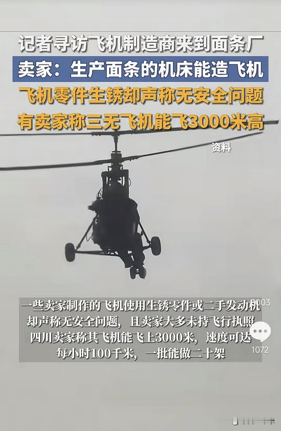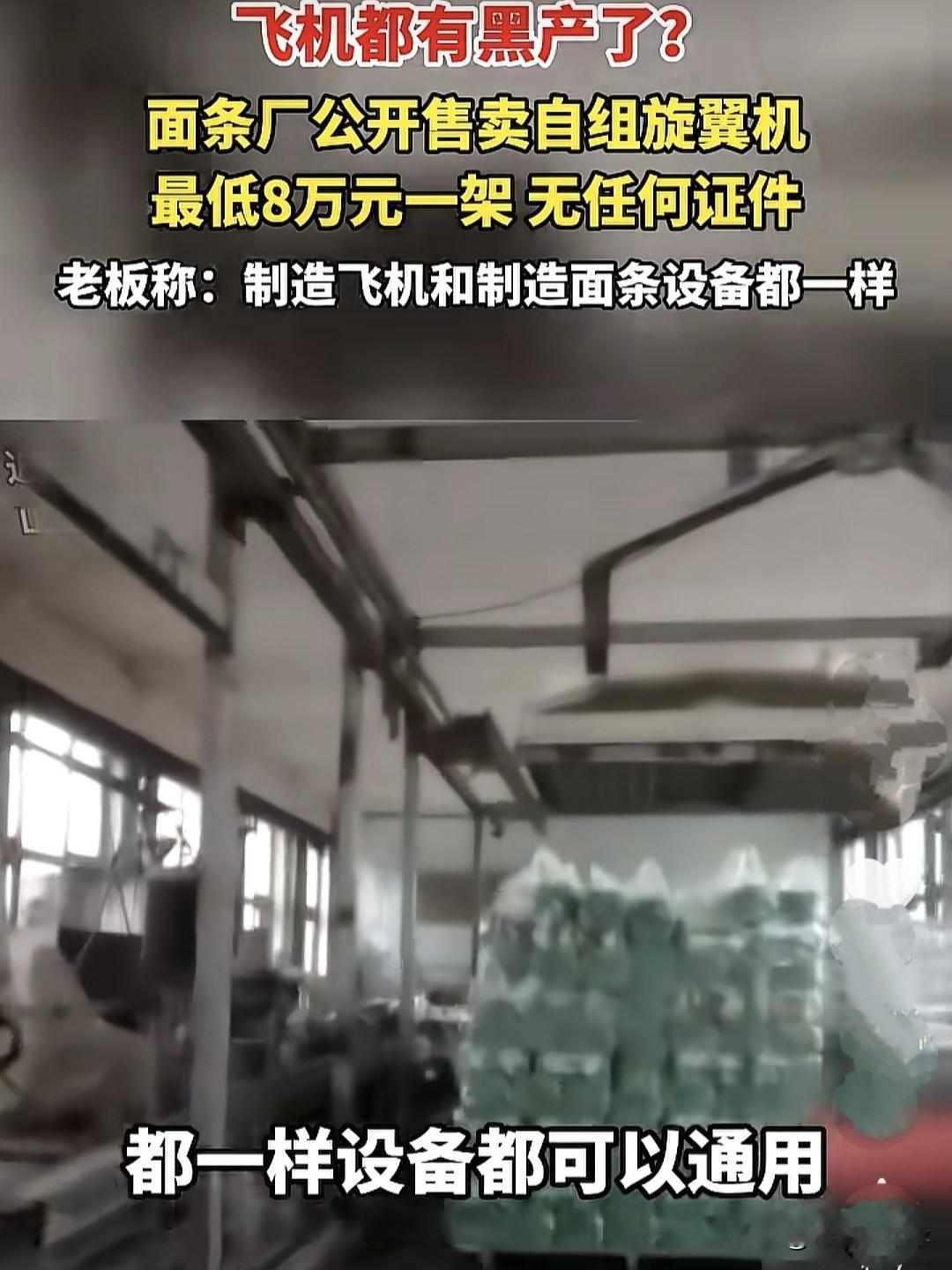 面条厂手搓飞机,山东邹平一家面条厂,老板一边加工面条卖面条,一边造飞机卖飞机,据买家评价,该面条厂手搓出来的“三无”飞机,能飞3000米高,速度可达一百公里每小时,而且还给开合格证明,目前该厂已被联合查处。