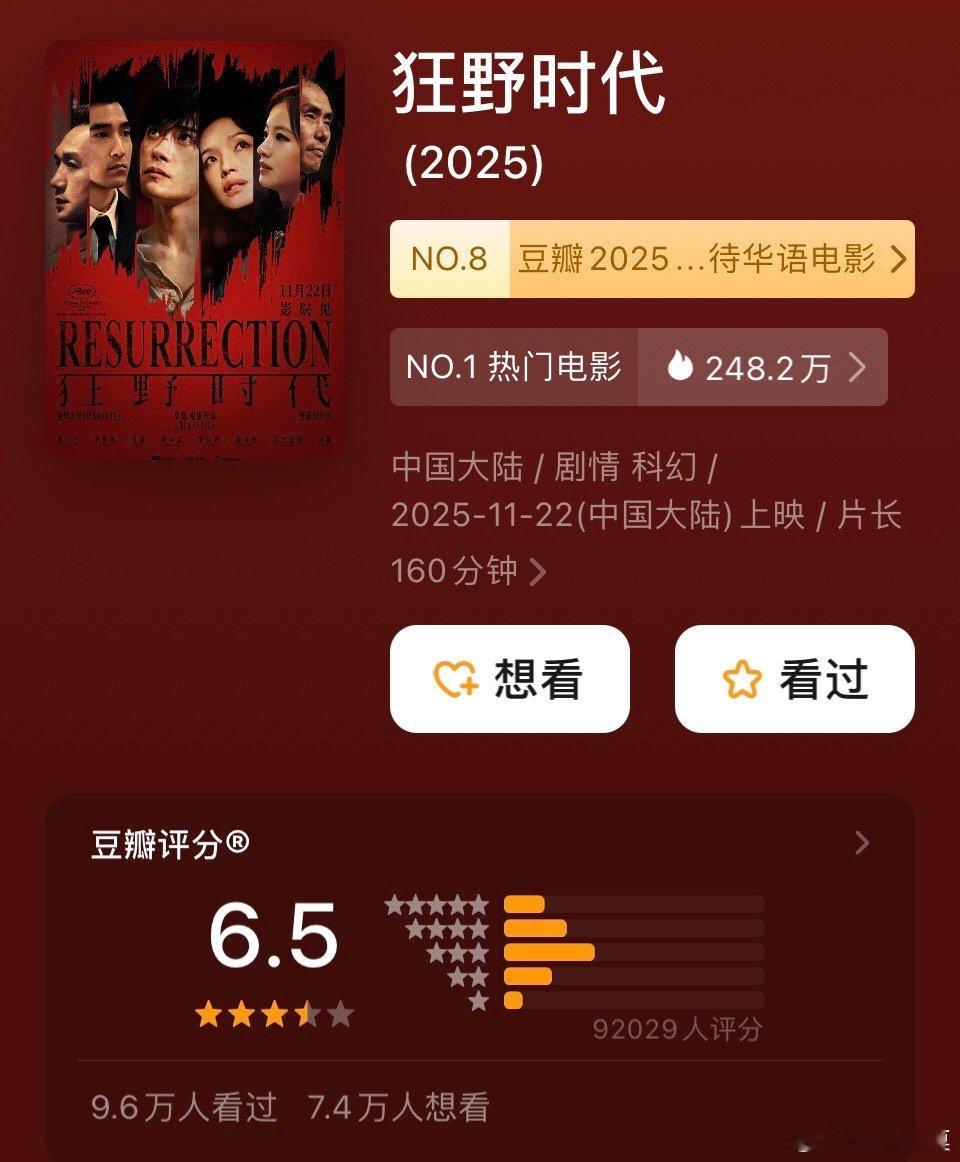 《狂野时代》豆瓣打分人数超9万,达到了9.2万多,比开分时的打分人数(2.76多万)多了6.4万多,不过豆瓣评分依旧维持在6.5分。不得不说,这个分数很稳定了。