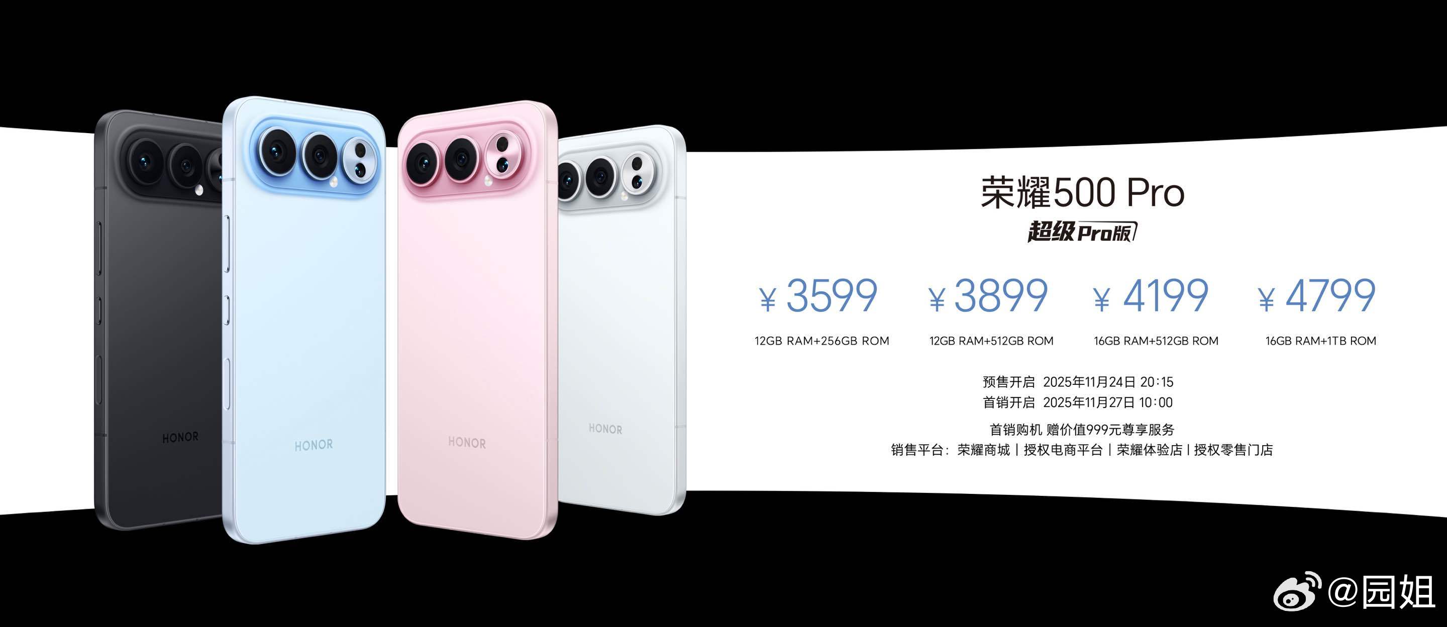 荣耀500标准版12GB+256GB、12GB+512GB和16GB+512GB版本售价分别为2699元、2999元和3299元;荣耀500 Pro版12GB+256GB、12GB+512GB、16GB+512GB和16GB+1TB版本售价分别为3599元、3899元、4199元和4799元
