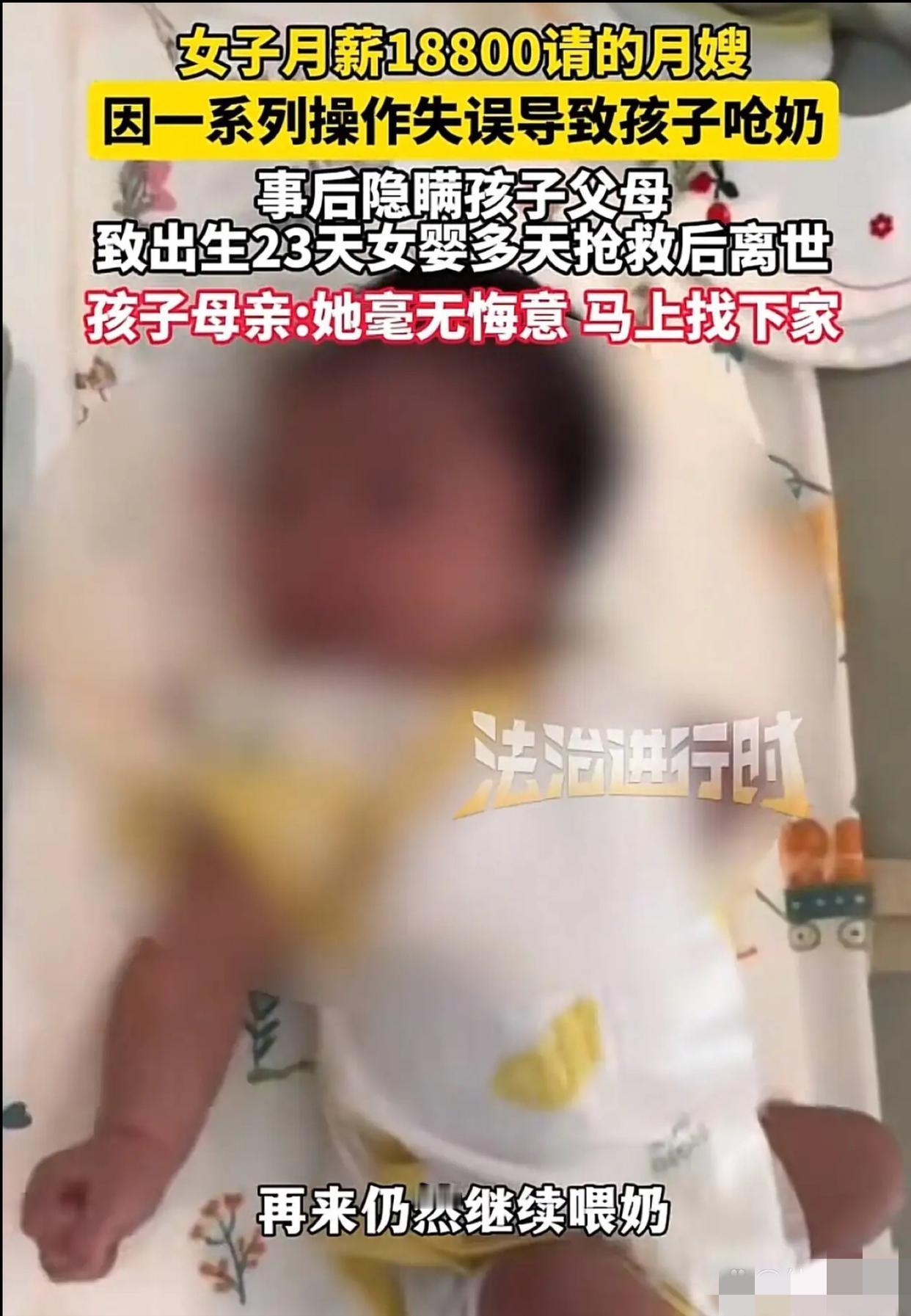 浙江杭州,大龄产妇生下一女,夫妻俩花18800元/月,请了个月嫂,起初,一切都还好,孩子出生后的第23天,月嫂因没有开大灯喂奶,导致孩呛奶。当送去医院以后,月嫂怕担责任,又故意隐瞒孩子呛奶的情况,耽误了医生抢救,最终,孩子死亡。事后,夫妻俩报了警。没想到,月嫂毫无悔意,在派出所拍着桌子,叫嚣:我连0.1%的责任都没有,是孩子先天有病! 奉先生和妻子结婚多年,才迎来女儿小泡芙的降生。 为了让孩子得到最好的照顾,奉先生夫妻通过家政公司,花18800元,请了号称“金牌月嫂”李某静。 小泡芙出生时,奉先生夫妻俩激动得好几天没睡好,给孩子买的小衣服小被子堆成了小山。选月嫂时,特意挑了证件齐全、号称有十年经验的李某静,想着贵点就贵点,只要对孩子好。头半个月,李某静确实看着挺专业,给孩子换尿布、拍嗝都利索,夫妻俩慢慢放了心,夜里就把孩子交给她带。 出事那天凌晨,奉先生被孩子的哭声惊醒,听见月嫂在隔壁哼哧哼哧哄着。他披衣过去看,屋里没开大灯,就床头一盏小夜灯,昏昏暗暗的。月嫂说孩子饿了,正喂奶呢。没等他说啥,就听见孩子“咳”了一声,接着脸憋得通红,哭声也没了。 月嫂慌了,手忙脚乱地给孩子拍背,可孩子嘴唇越来越紫。夫妻俩赶紧抱着孩子往医院冲,路上月嫂一个劲说“没事没事,可能是奶太急了”。到了医院,医生问情况,月嫂支支吾吾说“孩子突然就不对劲了”,压根没提呛奶的事。 等医生好不容易查出是呛奶引起的窒息,再抢救时已经晚了。小泡芙没撑过来,那个前一天还在妈妈怀里咿呀叫的小家伙,就这么没了。 奉先生夫妻俩哭得快晕过去,报警后,李某静在派出所还梗着脖子喊:“我喂了十年奶都没事,肯定是孩子自己身体弱!”家政公司也赶紧撇清关系,说月嫂的证件是真的,但操作失误是个人行为。 这哪是失误?明明是不负责任!夜里喂奶不开灯,看不清孩子状态;呛奶了不第一时间说清楚,活生生耽误了抢救时间。拿那么高的工资,却连最基本的责任心都没有,还敢称“金牌”?家长把刚出生的孩子交给你,是多大的信任,就这么被糟践了。 各位读者你们怎么看?欢迎在评论区讨论。