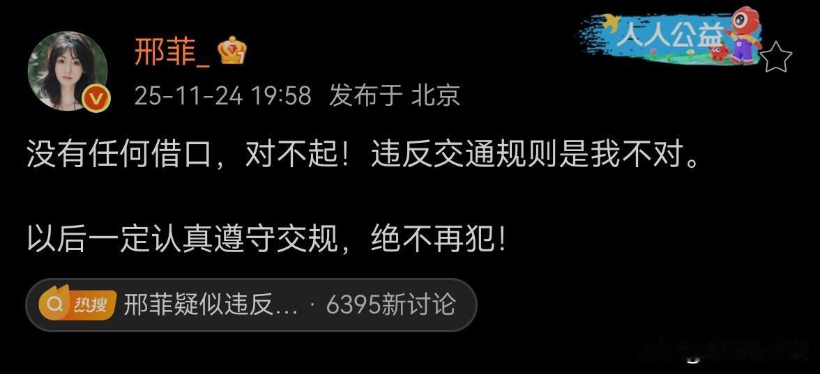 邢菲这次可真是闹了个大乌龙! 11月24日,有媒体曝光她开车时在三条车道的马路上压双实线调头,这妥妥违反道路交通法。 事情曝光后,邢菲很快发文道歉,称没有任何借口,违反交规就是不对,以后一定遵守,绝不再犯。 邢菲1994年生于内蒙古,毕业于上戏,因《大闹东海》被熟知,还出演过《致我们暖暖的小时光》等剧。 明星作为公众人物,一举一动都受关注,这次违规给大家提了个醒,无论谁都得遵守交规,希望她说到做到,别再犯了!