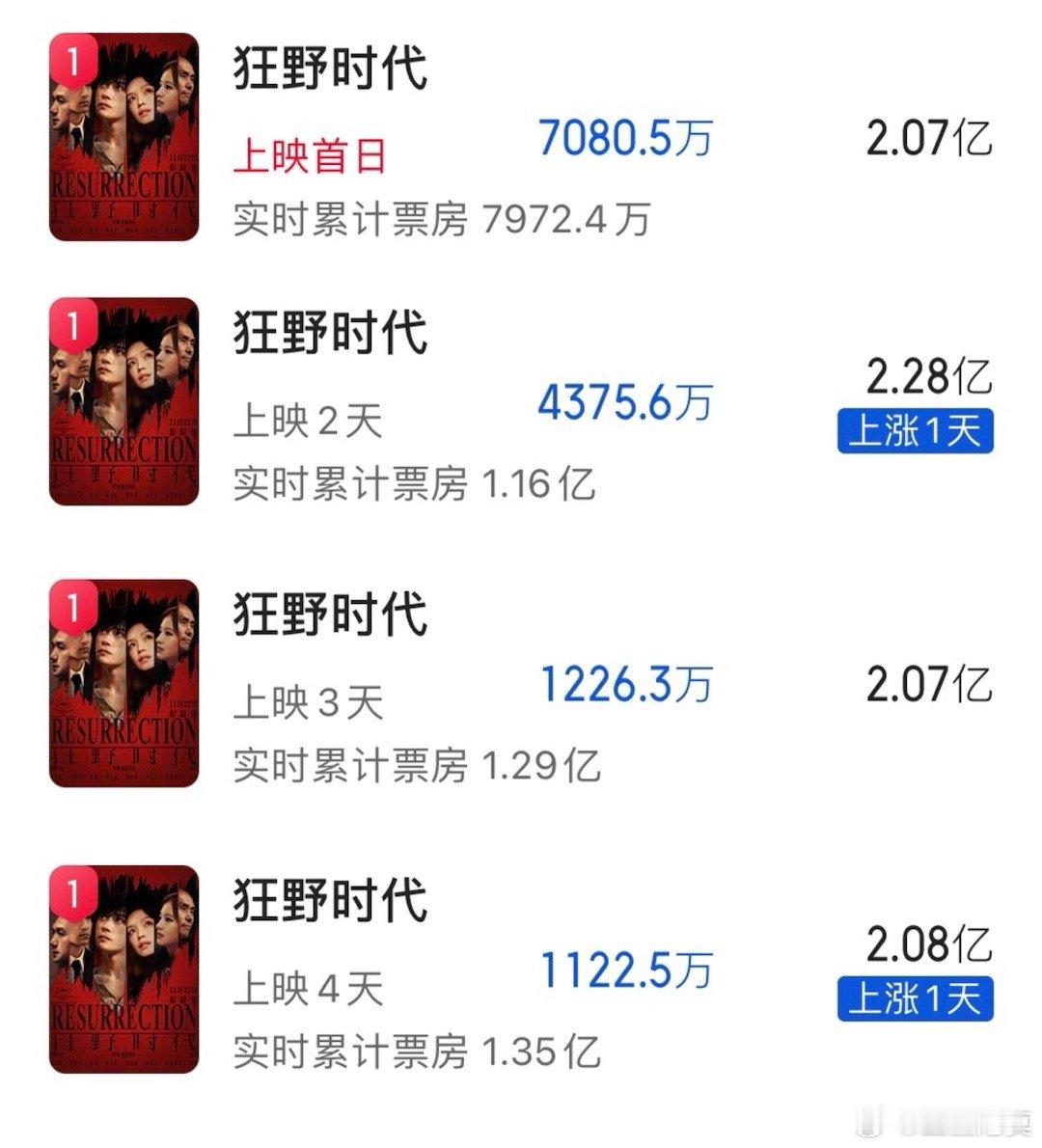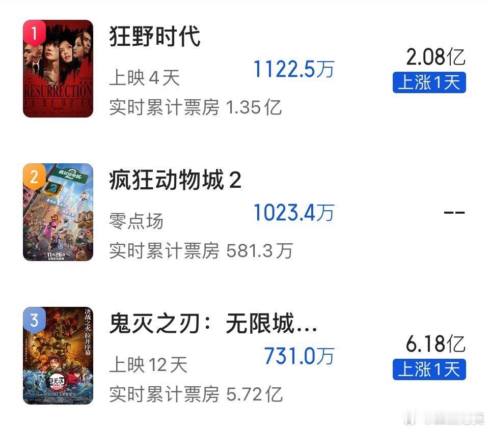 《狂野时代》预测票房微微上调,从昨天的2.07亿,上调至今天的2.08亿。《鬼灭之刃》预测票房破6亿,达到了6.18亿(昨天是5.94亿)。《狂野时代》4天的预测票房分别为:2.07亿、2.28亿、2.07亿、2.08亿。