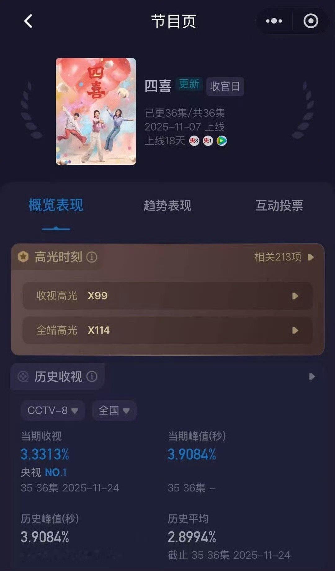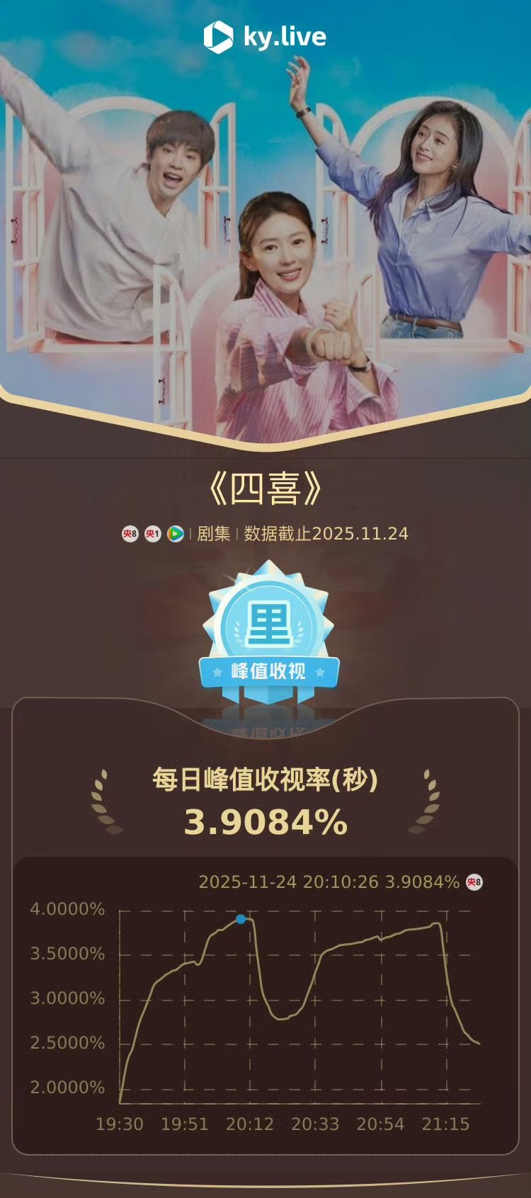 童瑶 蒋欣 黄明昊主演的电视剧四喜今晚收视率再创新高峰值达3.9084%