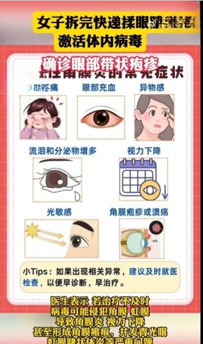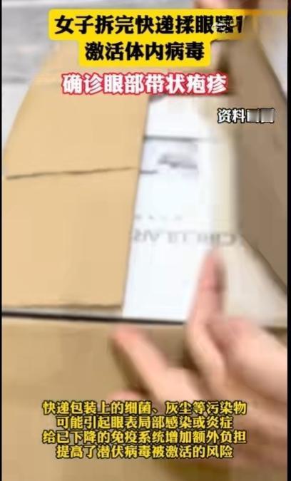 拆快递揉眼疼到崩溃!9成人都带“病毒炸弹”,这隐患藏不住了 杭州27岁姑娘双十一拆完快递揉了下眼睛,当天眼周就红得像充血的番茄,水疱一簇簇冒出来,确诊眼部带状疱疹——那疼可是10级暴击,比生孩子还酸爽!无独有偶,湖北也有女士栽在同一个动作上,歌手那英、蔡国庆都曾被这病缠上,那英的疱疹还长到了眼睛里。 说到这个,很多人以为是快递包装带病毒,其实咱体内早藏着“老冤家”!小时候得过水痘的人,病毒就像藏在神经节里的“潜伏特务”,90%以上的成年人都带着它。现在人熬夜剁手、拆快递疯到忘乎所以,免疫力直接跌到谷底,这时候用沾了灰尘细菌的脏手揉眼,不就等于给“特务”递了引爆器?我敢说,接下来还会有更多年轻人中招,毕竟双十一快递潮还没退,大家拆包裹的热情没减,熬夜、不洗手的坏习惯也没改,病毒不找这类人找谁? 更扎心的是,这病专挑“虚弱的人下手” ,50岁以上中老年人和免疫力差的群体风险翻倍。10级神经痛可不是开玩笑,疼起来坐立难安,严重时还会伤角膜、毁视力,甚至引发脑炎。数据显示,三分之一的人一生会遭遇带状疱疹,这概率跟中彩票似的,谁能保证自己是幸运儿? 其实这事儿说到底,就是生活里的小细节没注意。快递包装长途跋涉,脏得能当“灰尘收集器”,拆完洗手能费多少事?免疫力才是咱的“护身铠甲”,别为了剁手熬垮身体。你有没有拆快递后不洗手的习惯?或者见过谁被带状疱疹缠上?评论区聊聊你的经历~带疱疹后遗症 脸部疱疹 眼部疱疹