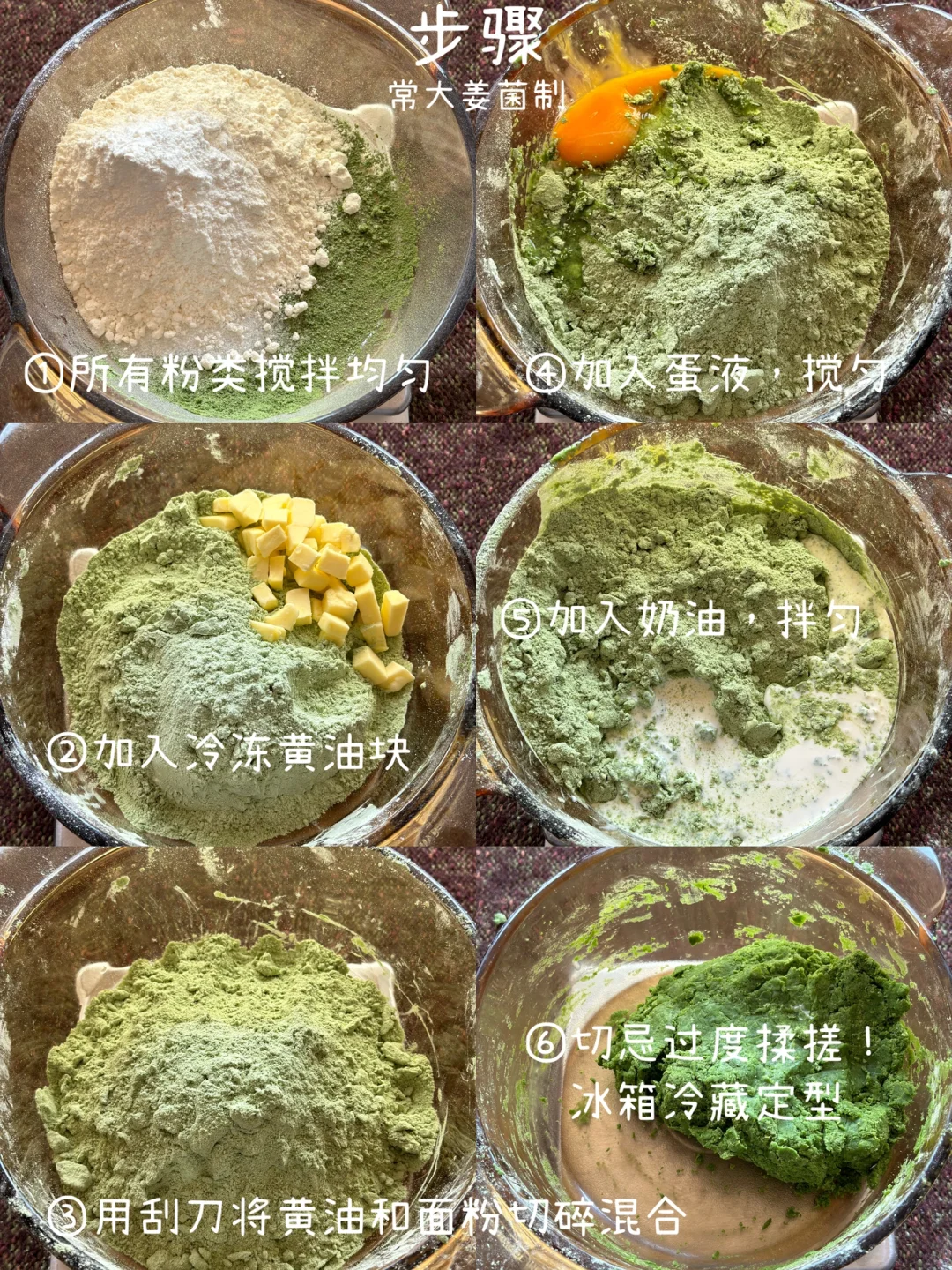 低筋粉150g、抹茶粉10g、泡打粉5g、 糖35g(已减)、盐一撮。