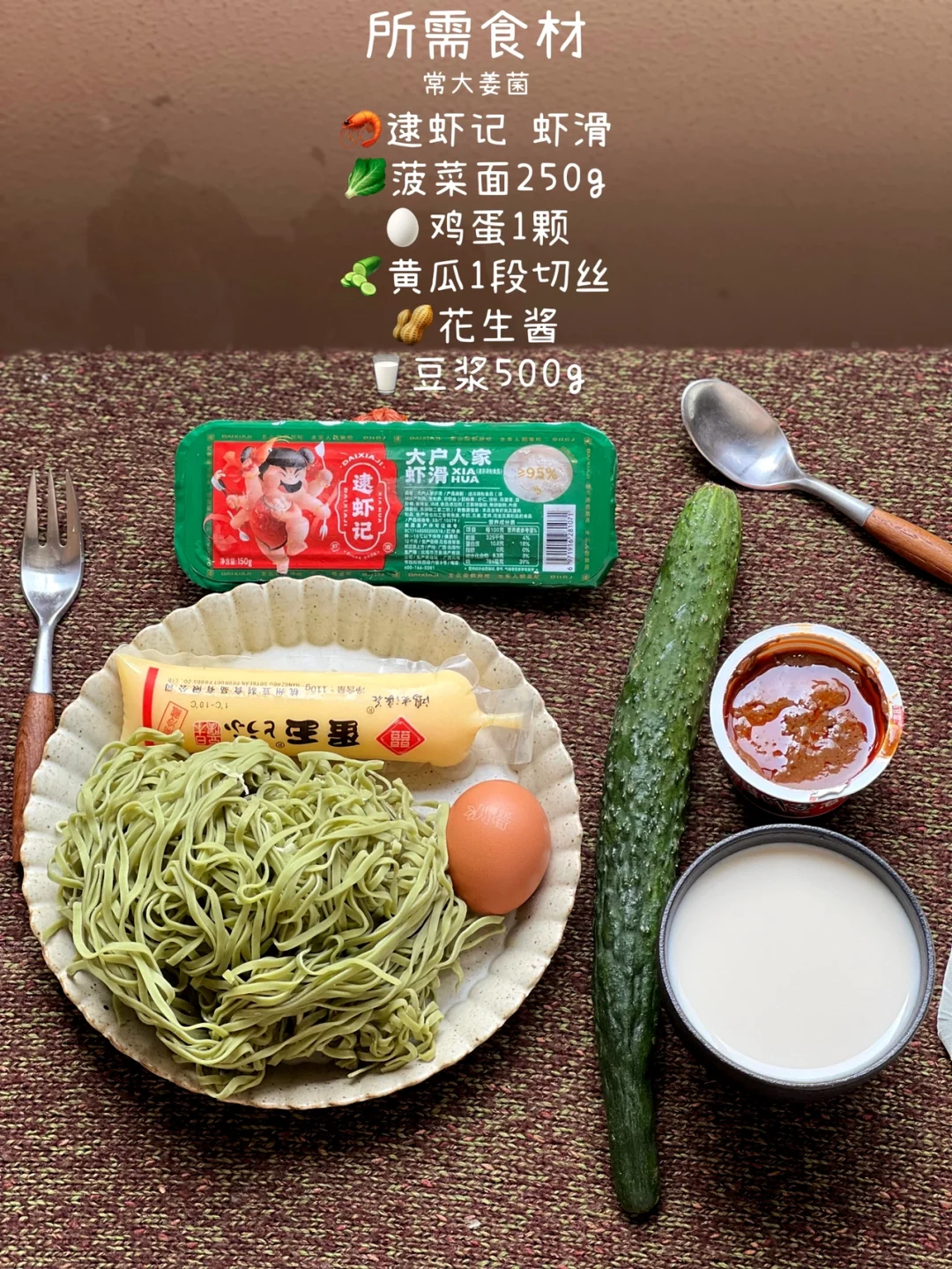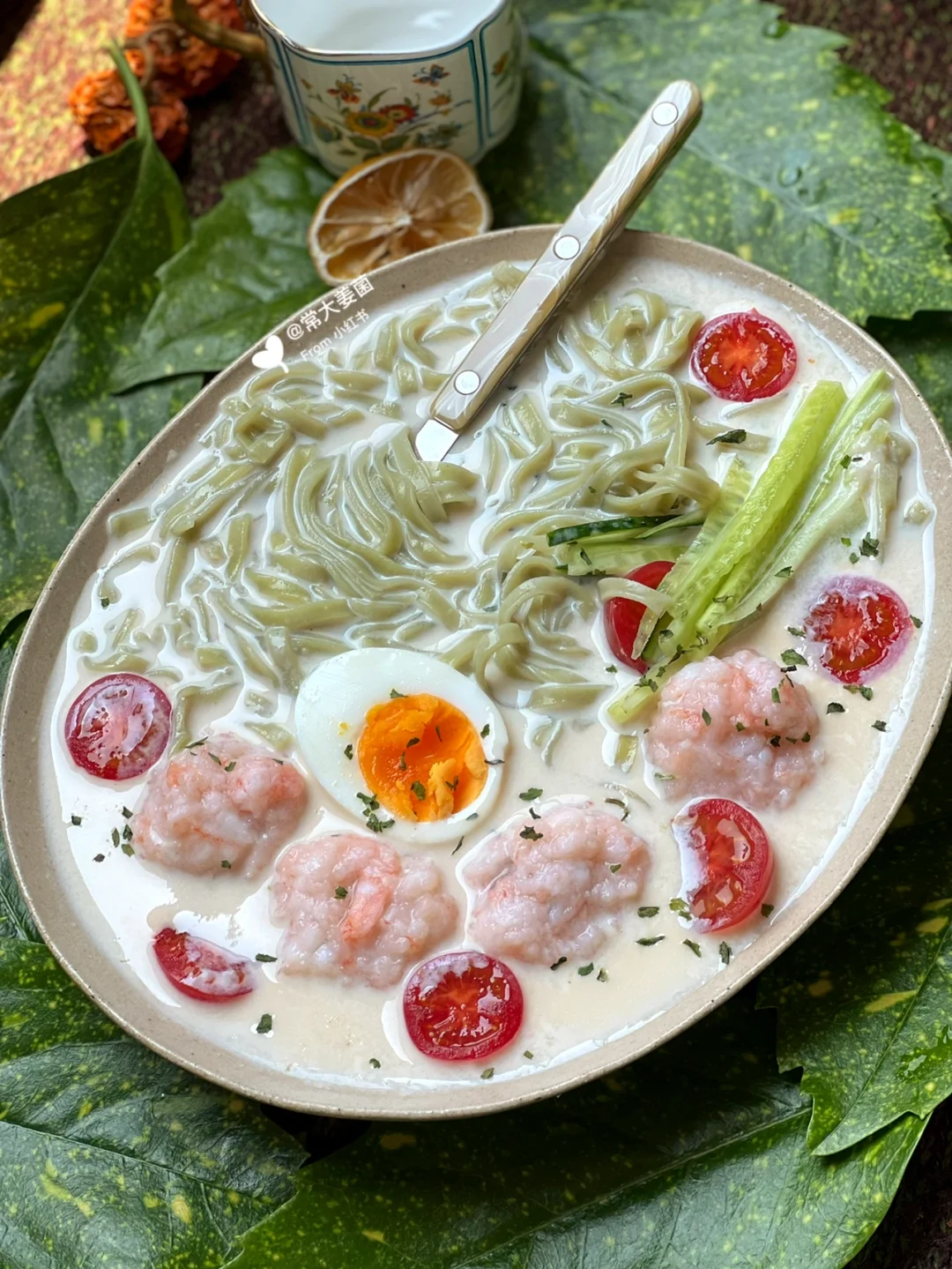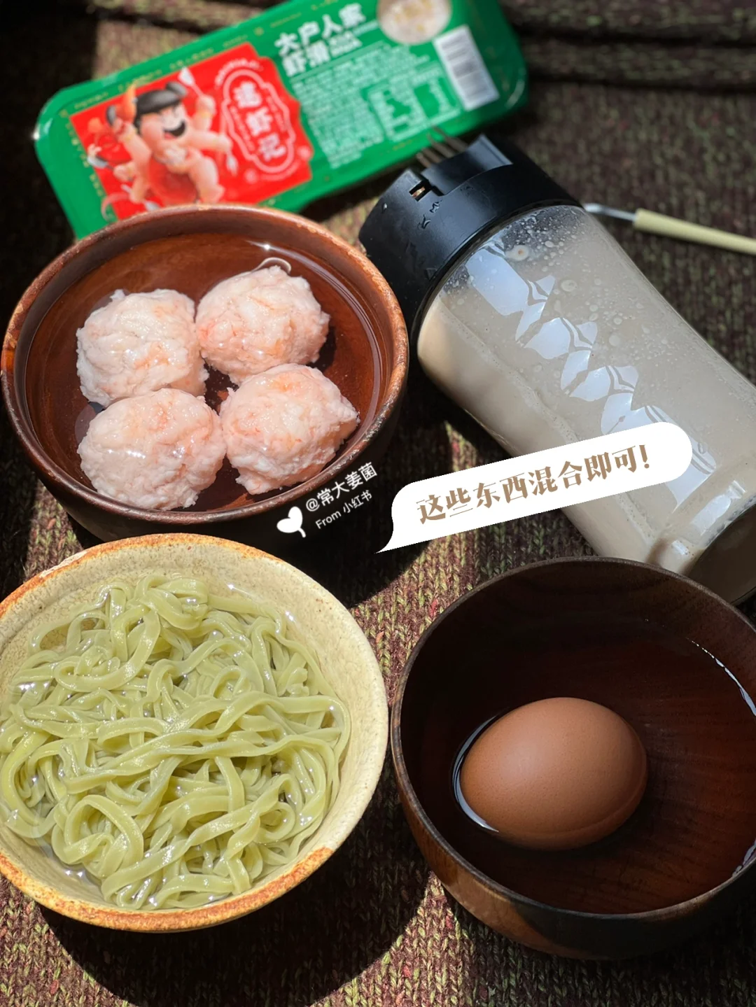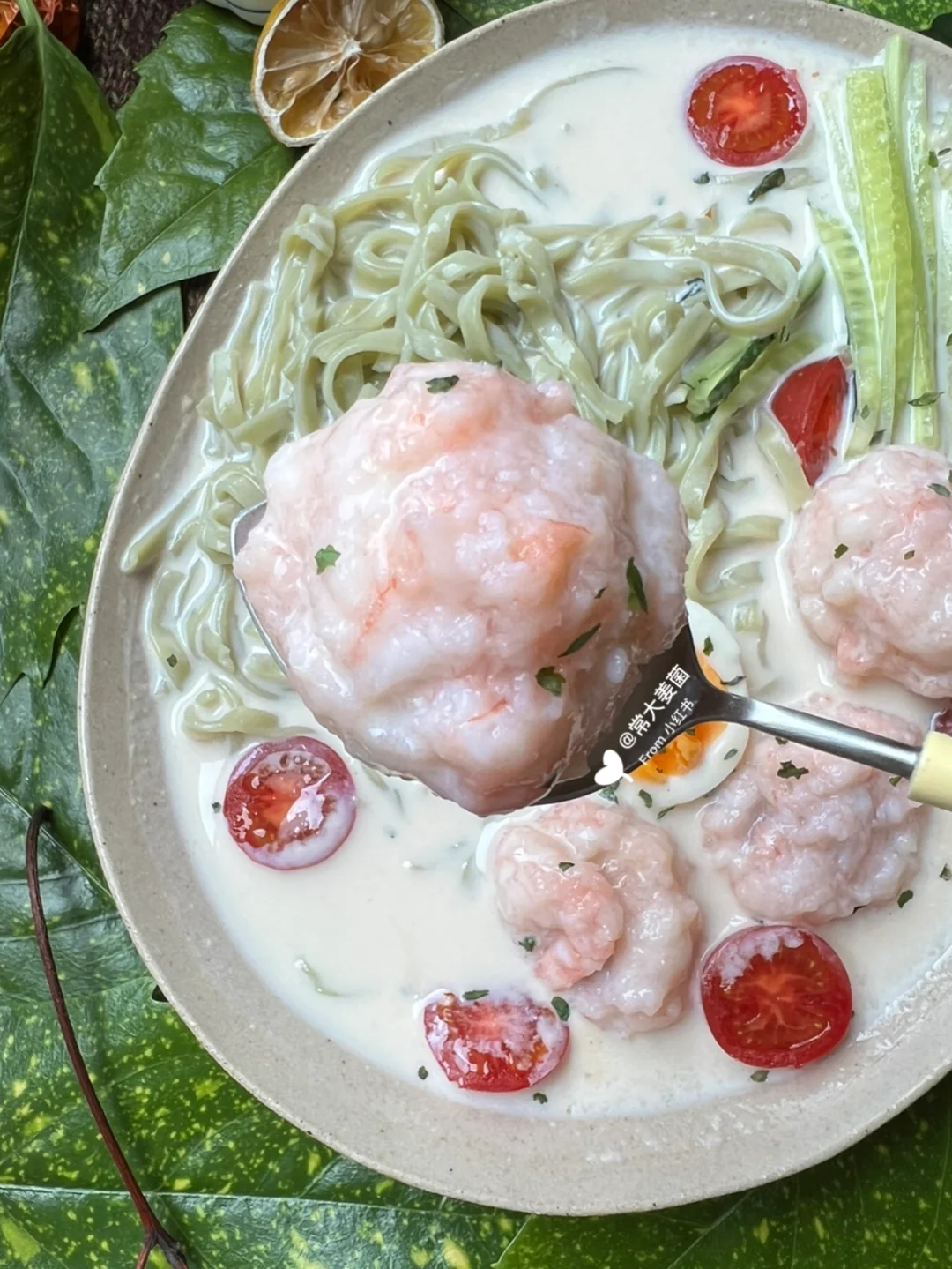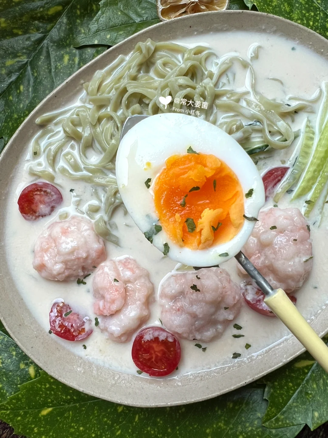🥬菠菜面➕🦐虾滑球➕🥒黄瓜丝➕🥚糖心蛋➕🍅小番茄(风味比大番茄好~)
