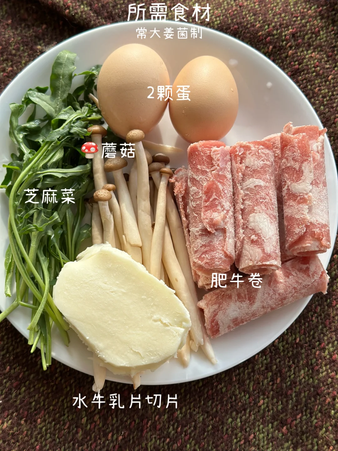 🥩肥牛、🥬蔬菜、🍄蘑菇、🧀奶酪、🥚鸡蛋