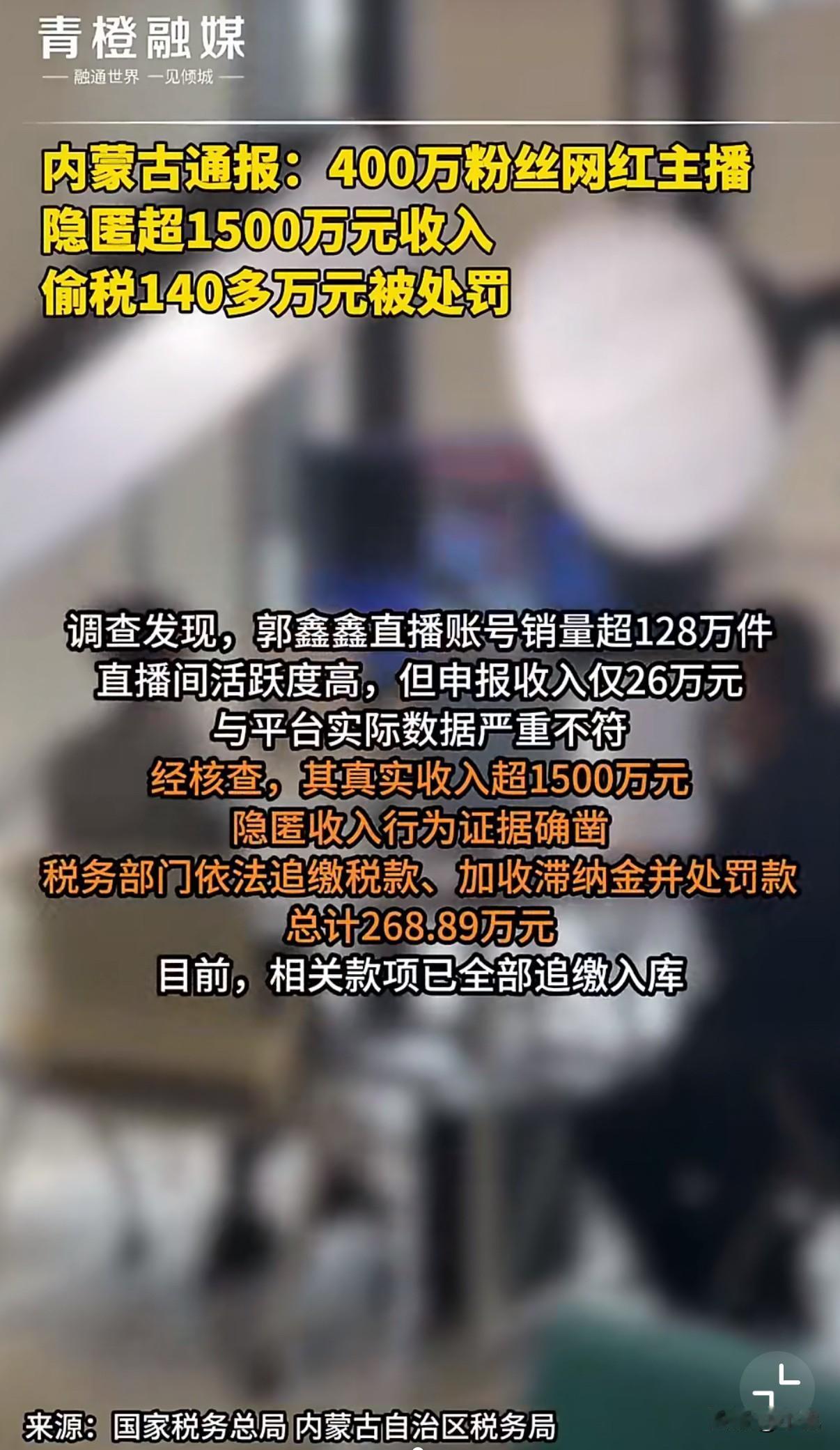 震惊!网红自称两年赚26万,实际收入超过1500万! 刚刚看到一则新闻,税务部门查了一批网红偷税案。有个主播声称自己两年只挣了26万,结果被查出隐匿收入1500多万,最后补税加罚款将近270万。还有个网店,三年卖了184万件商品,居然只交了36元税。 这些数字看得人目瞪口呆。 现在网红偷税手段真是五花八门。有人用个人银行卡收打赏和佣金,故意不申报;有人注册好几个空壳公司,把收入拆得零零碎碎;还有MCN机构教主播怎么逃税,把这当成招揽主播的诱饵。 我记得有个主播在直播间说:“家人们,我这点收入也就刚够温饱。”结果私下用亲戚的银行卡收了上千万。被查到后,他辩解:“这些都是礼物,不算收入吧?” 税务人员直接告诉他:“无论是打赏、佣金还是带货收入,都是经营所得,必须依法纳税。” 今年开始,平台必须向税务部门报送经营者的收入信息。这意味着,那些小聪明藏不住了一一每个人的收入在税务系统里都是透明的。 想想也是,这些网红靠着粉丝支持赚得盆满钵满,本该带头守法纳税。可偏偏有人贪心不足,既要高收入,又不想尽义务。 有个被查的主播后悔莫及:“早知道会被查得这么严,当初就该老老实实纳税。现在不仅要补税,还要交罚款,账号也封了。” 网友们的反应很真实。有人说:“我们上班族每个月工资明明白白扣税,他们赚这么多还想逃税?”也有人表示:“支持严查,这才是真正的公平。” 网红经济是新生事物,但纳税义务没有新旧之分。线上线下,守法经营都是底线。 想要在互联网行业长久发展,依法纳税这门课必须及格。流量再大,名气再响,一旦触碰法律红线,积累再多的人气也会瞬间崩塌。 你觉得呢?