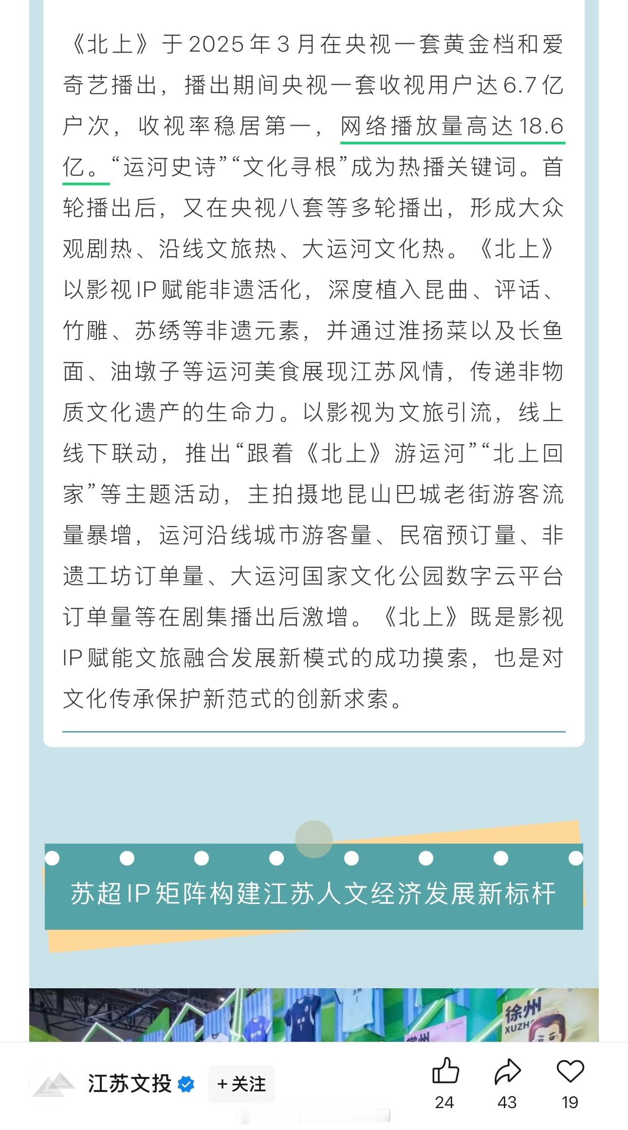 江苏文投发的:白鹿北上网播播放量高达18.6亿!哇集均4895万!