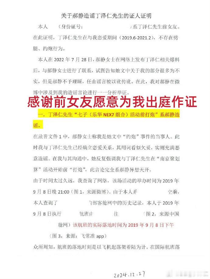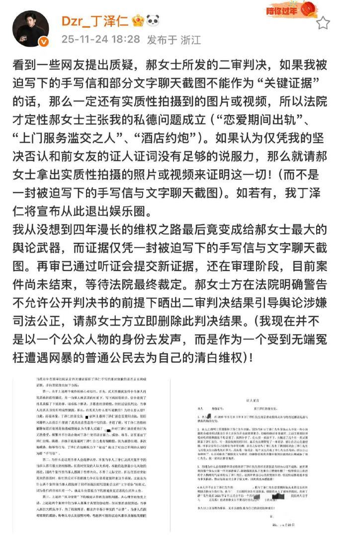 丁泽仁正面回应网络质疑!晒前女友证词与行程证据反驳传闻,强调除被迫手写信外无其他问题,指控唯一的姐违反法院规定公开判决书,要求其删除并停止引导舆论。