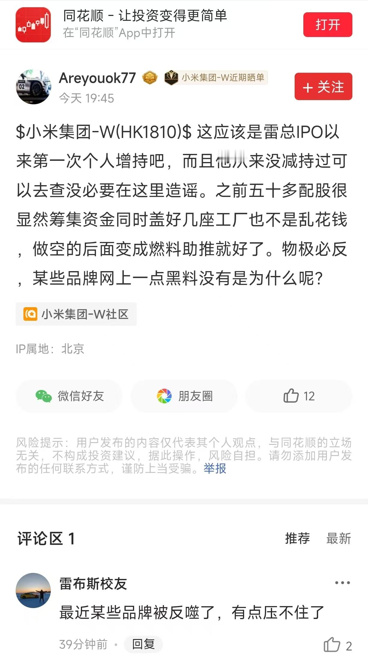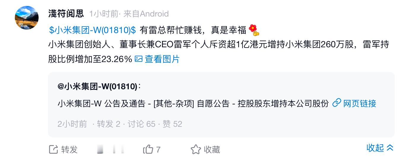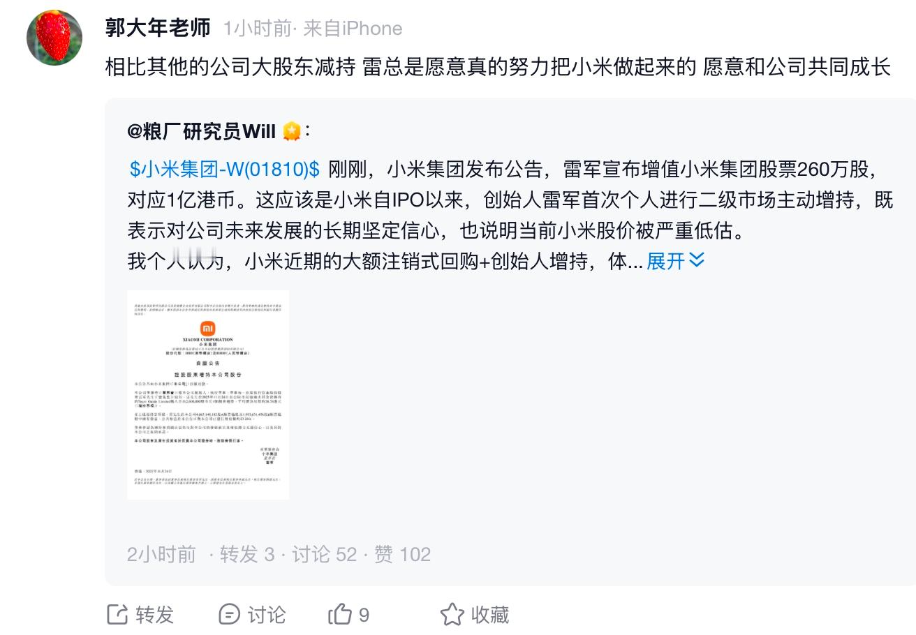 创始人自己用真金白银买股票,看得出雷总对小米未来很有信心,从20日、21日,小米连续两天回购2150万股,总斥资金额超8亿港币,雷总个人再斥资1亿增持股票,公司回购+创始人增持,一套组合拳打得很明白,就是告诉你我有信心,对未来的增势更有信心……阿米本身现金流就稳健,加上Q3业绩增长不错,所以说,小米管理层对发展前景看的很清楚,不仅是自己的信心,也是给股东信心。