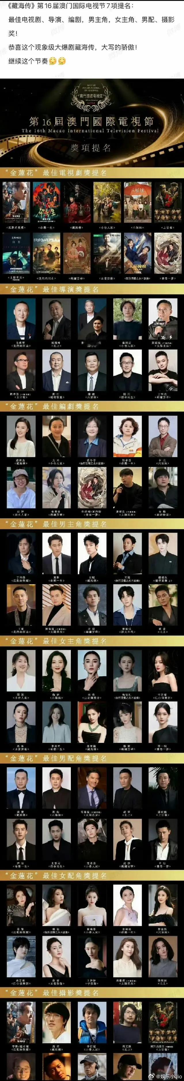 藏海传获得澳门国际电视节七项提名,分别是最佳电视剧、最佳导演(郑晓龙/曹译文)、最佳编剧(赵柳逸)、最佳男主角(肖战)、最佳女主角(张婧仪)、最佳男配角(黄觉)、最佳摄影,这是爆剧该得的