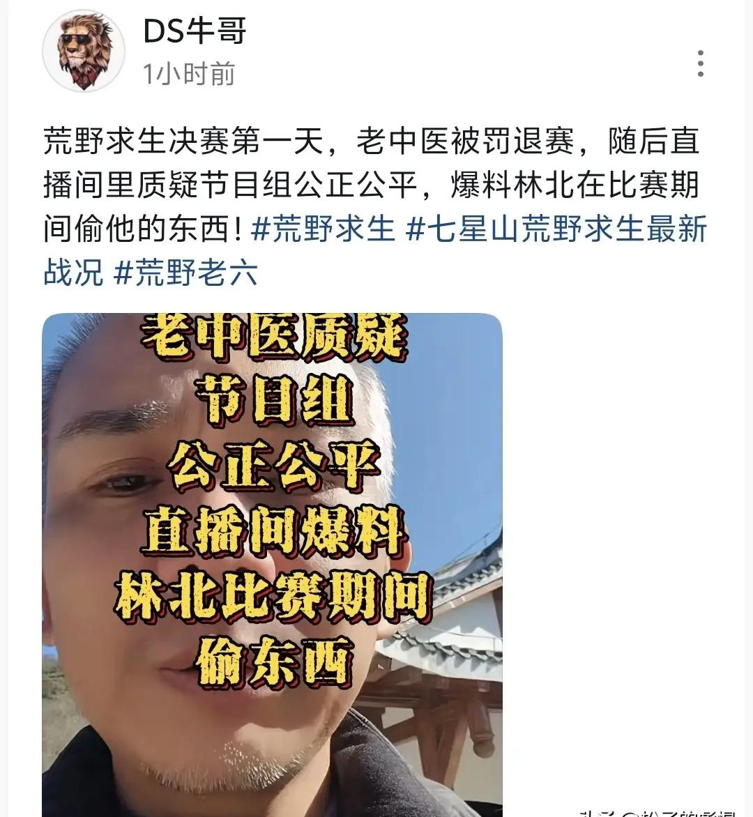 荒野求生老中医被罚下回应。 谁也没想到在比赛的第一天,荒野求生物品检查,老中医因为鞋垫藏有线被红牌罚下。 然而老中医在上午被罚下,下午就开启直播,直播中老中医对于自己所做作为完全不认。认为是节目组不公平,裁判有水分。 网友骂老中医作弊,而老中医在直播间中吐槽林北偷了自己的猕猴桃质问大家这完全是不公平。 至于鞋垫里的线,老中医有自己的说辞,声称是粉丝送的。自己被做局了,至于做不做局不知道,这表现完全是事后把你自己洗白,这完全是和场上被抓包,完全不一样的态度。 当时的老中医完全是默不作声和反驳,如今被罚下了,这才开直播澄清,更像是贼喊抓贼。 不管怎么说吧,罚下就被罚下了,事已至此,没有什么好辩解的,你们认为呢?