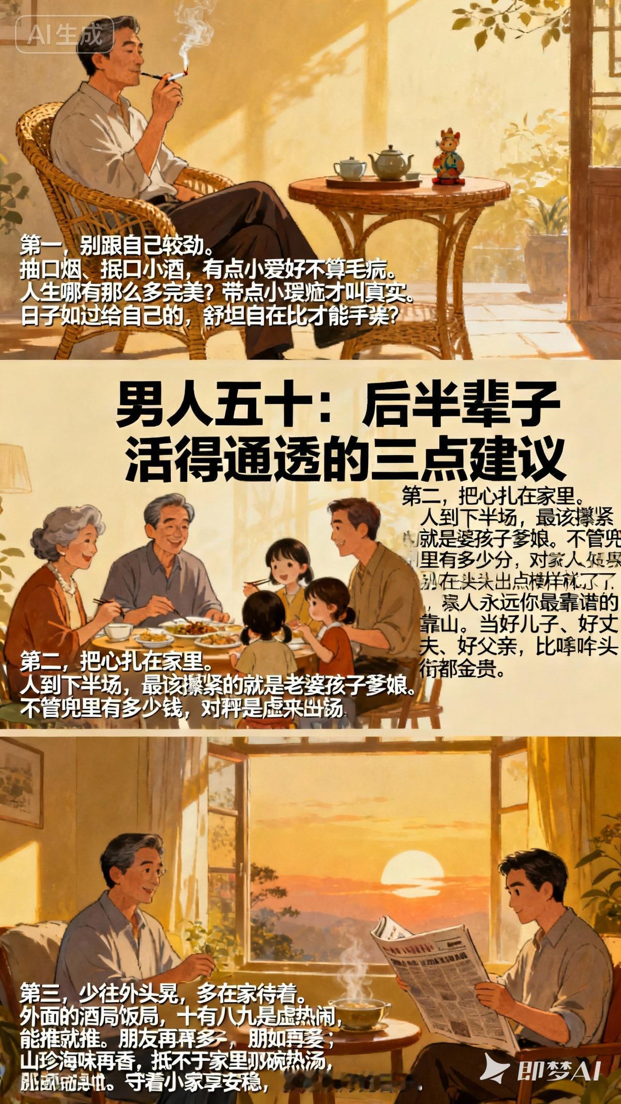 男同胞们,要是你今年50岁了,这三点掏心窝的话可得听进去,后半辈子才能活得通透! 第一,别跟自己较劲。抽口烟、抿口小酒,有点小爱好不算毛病。人生哪有那么多完美?带点小瑕疵才叫真实。日子是过给自己的,舒坦自在比啥都强。 第二,把心扎在家里。人到下半场,最该攥紧的就是老婆孩子爹娘。不管兜里有多少钱,对家人好是本分。别在外头混出点模样就忘了根,家人永远是你最靠谱的靠山。当好儿子、好丈夫、好父亲,比啥头衔都金贵。 第三,少往外头晃,多在家待着。外面的酒局饭局,十有八九是虚热闹,能推就推。朋友再多,不如妻儿围坐的温暖;山珍海味再香,抵不过家里那碗热汤。守着小家享安稳,就是顶好的日子。 男人五十 生活感悟五十岁后的醒悟