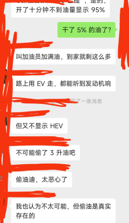 真的不是我一个人说比亚迪偷油,好多人人都在喊偷油。今天早上我低速转弯时强制EV也烧我的油,因为我刚跑HEV跑了几十公里没多久,现在比亚迪直接不给你显示HEV模式,你只能靠声音来感觉比亚迪是否在偷油?我现在开车经常是竖着耳朵来判别比亚迪是否在偷油。