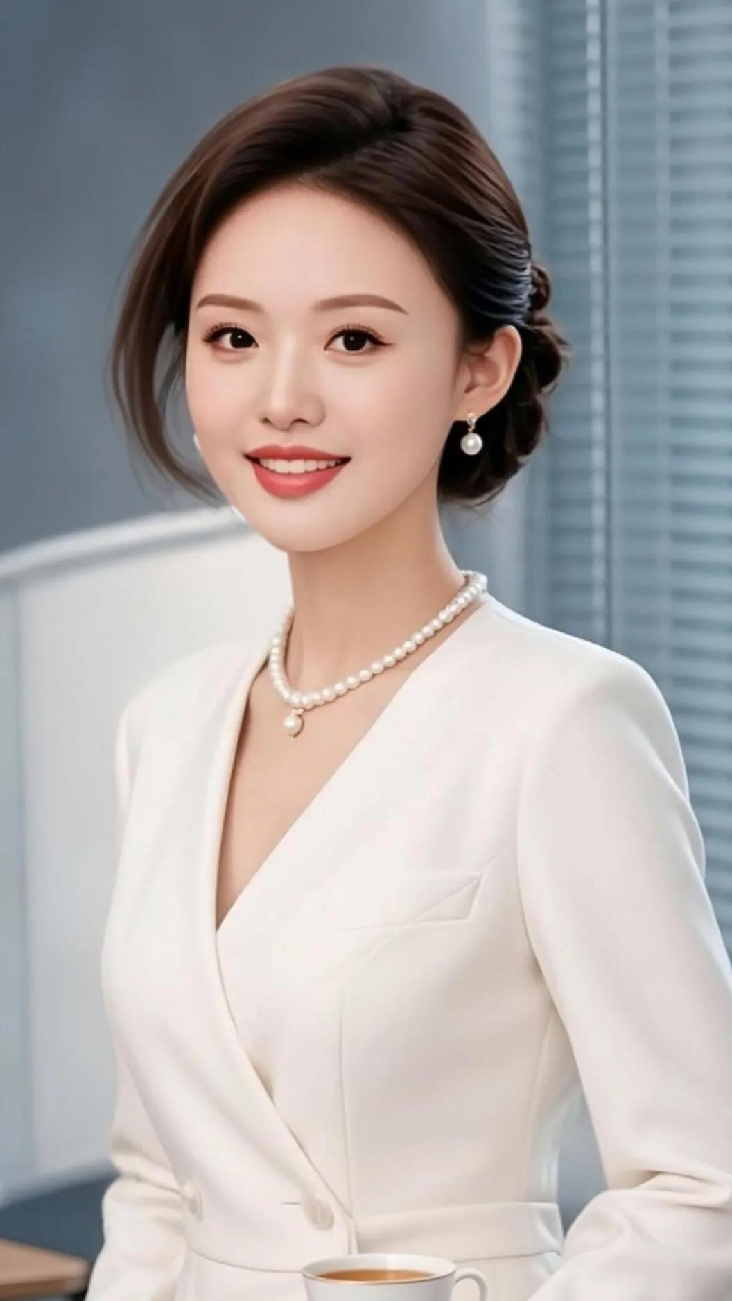 优雅白领,珍珠项链,微笑动人,咖啡相伴。