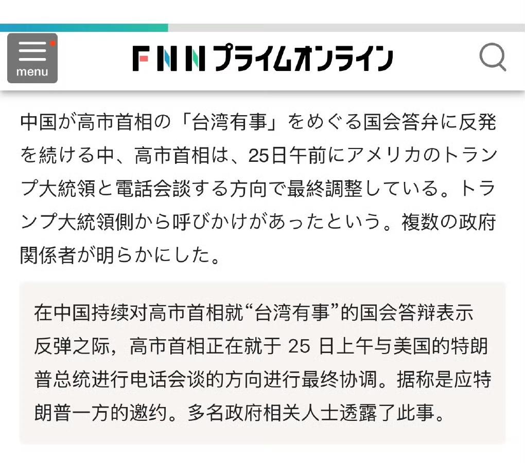日本富士新闻报道,11月25号上午,特朗普与高市早苗通电话,且通话是特朗普提出的。 日媒称,特朗普在与中方通话后,已主动邀约日本首相高市早苗通话,目前高市正在安排。 此外,日本官房长官在中美元首通话后表示,“中美关系的稳定对包括日本在内的国际社会极为重要。”