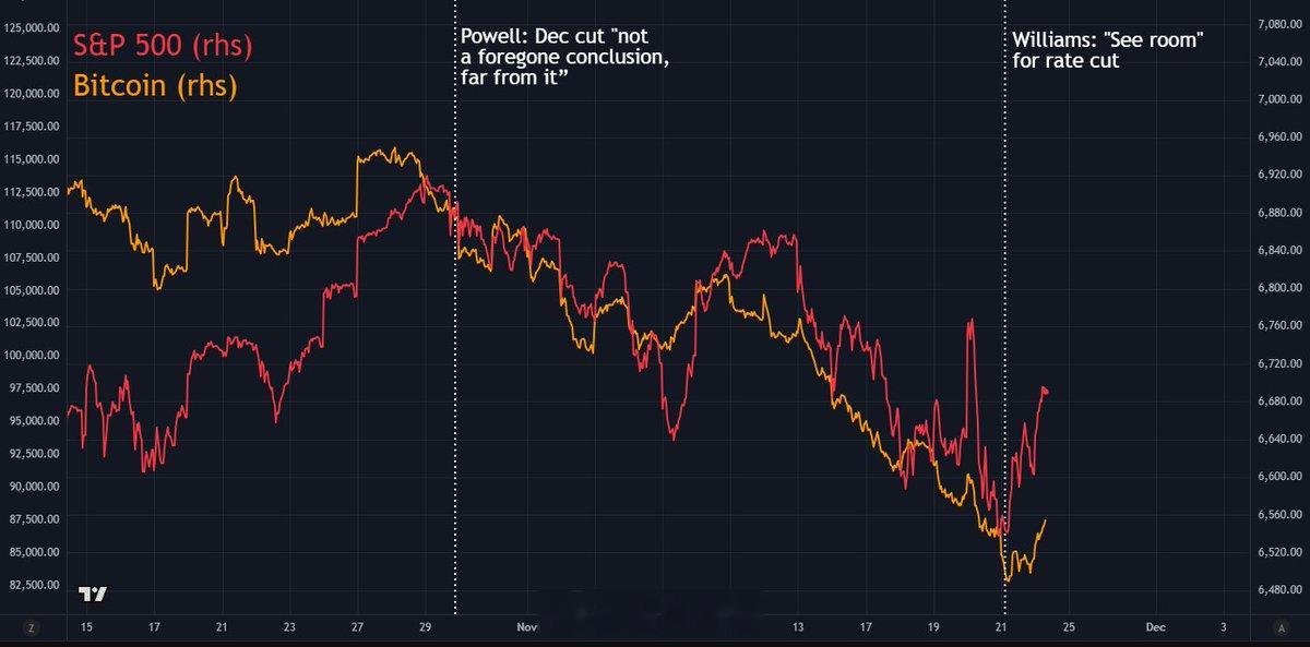 美股涨跌,全靠嘴炮。数周以来,市场走势一直与12月降息的预期紧密相连。自10月联邦公开市场委员会(FOMC)鹰派降息以来,风险资产一直在下滑。鲍威尔表示,12月降息“并非板上钉钉,远非如此”,随后其他美联储成员也纷纷表示反对降息。周五,纽约联储主席约翰·威廉姆斯发表讲话,称:“我认为短期内仍有进一步调整目标区间的空间。”而这番话恰恰标志着市场触底。