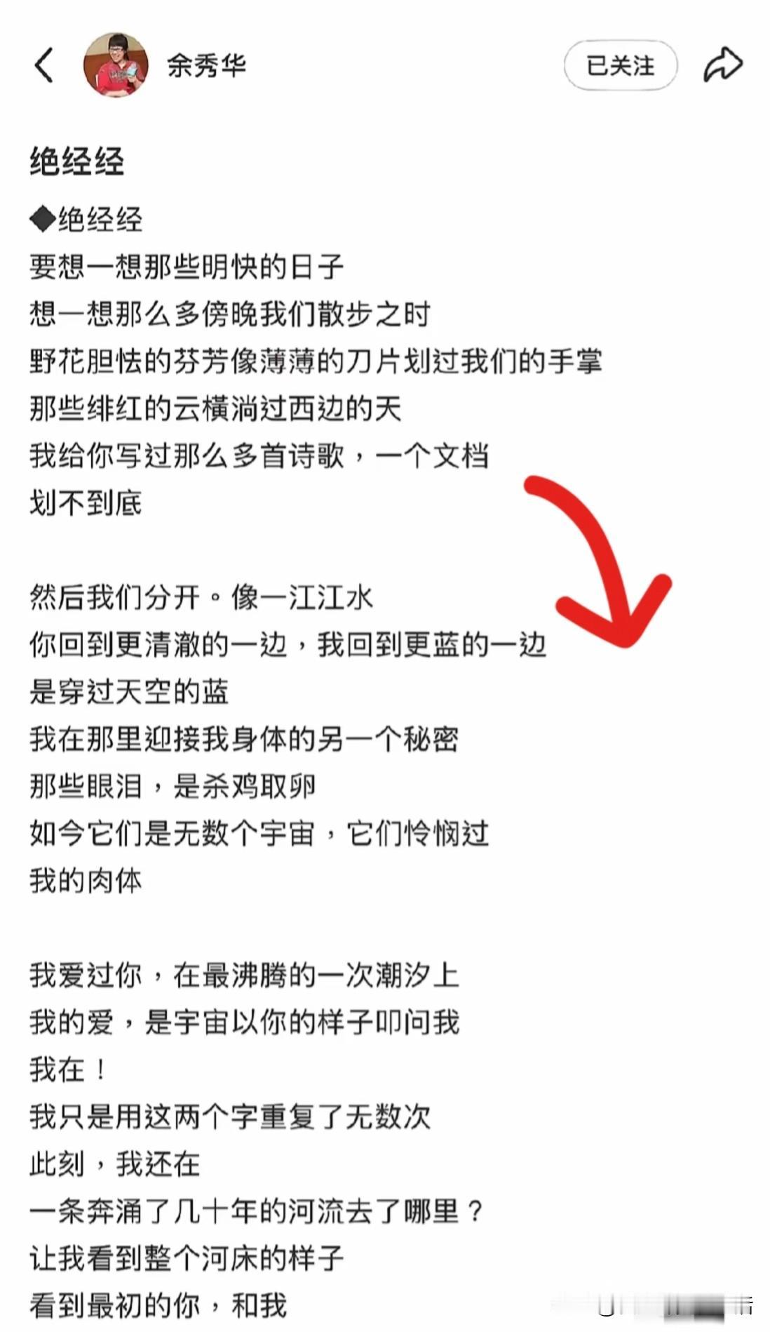 真的是老天爷赏饭,能够写出这么好的诗,绝经了都要记录一下。 如果把标题去了,估计80%的人看不出来这是一首关于绝经的诗,相对于她以前某些诗歌,写的非常克制、隐喻、唯美。 她是不完美的,幸好老天爷给她关上一扇门,开了一扇窗。