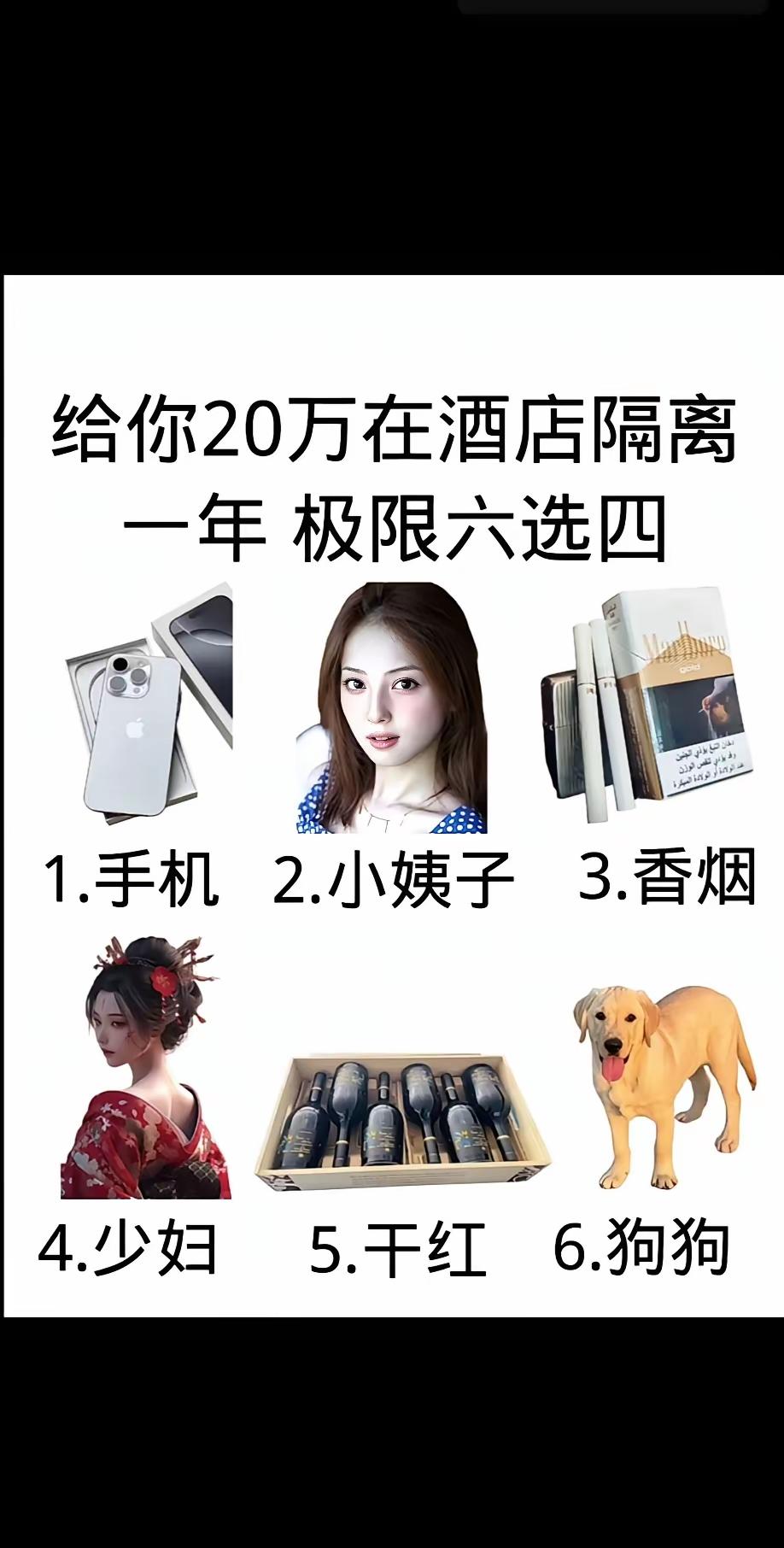 给你20万,在酒店隔离一年,极限6选4,你怎么选? 你可能会犹豫,估计没法选?因为没有说明白在酒店呆一年,是否管饭?是否管烟?是否管干红?如果都不管,这20万够住一年酒店的吗?那么,如果这些在20万之外,不用你负责呢? 还是回到问题,估计你没看明白要求,是极限6选4,就是说最多6选4,没说必须6选4,所以你可以6选1,可以6选2,可以6选3,但是极限6选4,那么此时此刻你怎么选?