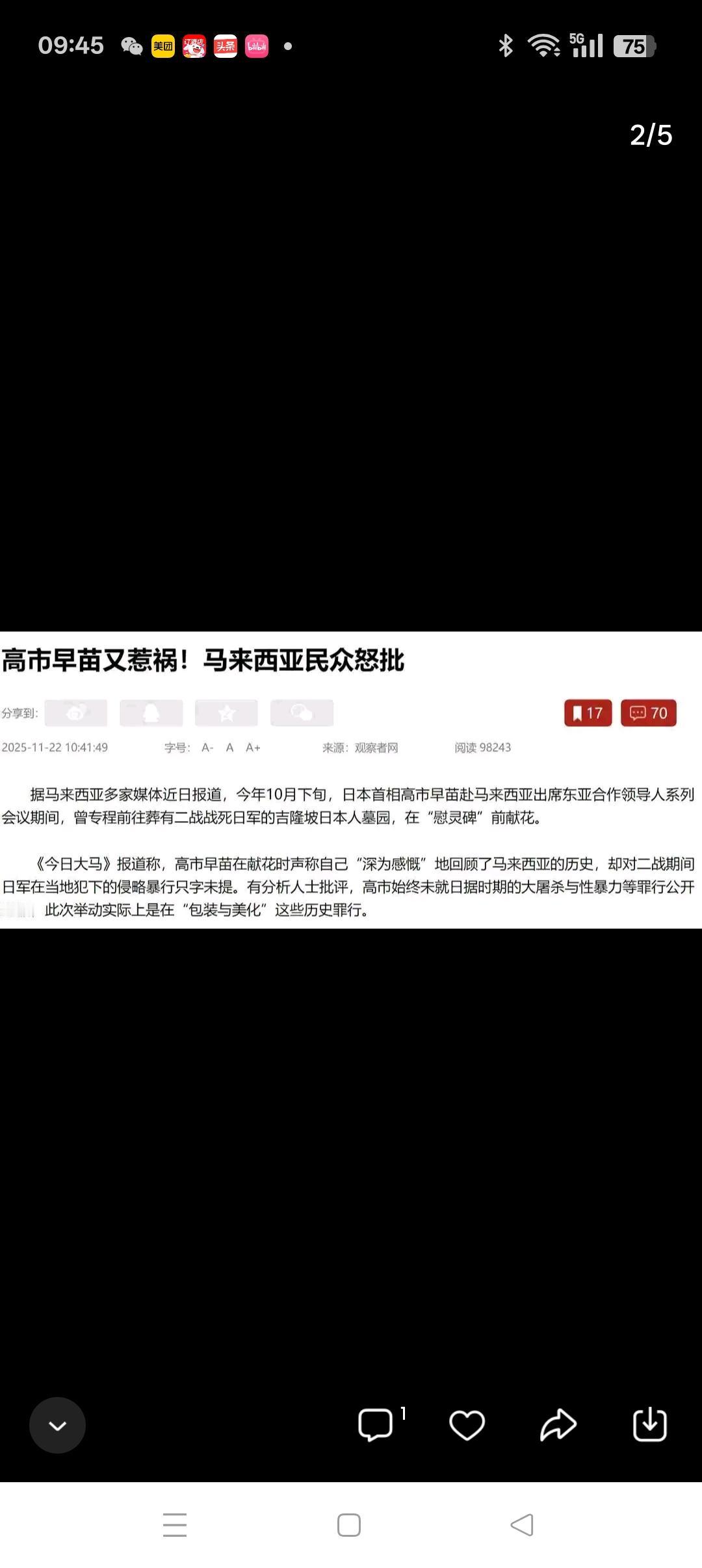 想不到为高市早苗站台打气的竟是新加坡?! 近一两个月来,因高市早苗错误言论而挑起的中日纷争,愈演愈烈。对此,包括美国在内的西方囯家都没有公开为高市早苗的倒行逆施摇旗呐喊,想不到唯有新加坡站出来为高市早苗站台打气。 11月19日新加坡总理黄循财以亚洲国家的代表自居,以教师爷的口吻,公开说希望中国对日本“高抬贵手”,还说日方已经拿出了降温行动。一边督促中国“点到为止”止,一边鼓吹东盟应“放下抗日历史”信任日本,甚至妄称地区国家可指望日本充当“保护伞”。 作为华人为主体的国家理当与中国同仇敌忾,况且二战期间,新加坡也曾遭受到日本军国主义的侵略蹂躏。前事不忘,后事之师,想必新加坡是脑残了不是,如果坐待日本军国主义复活,有朝一日,日本新法西斯必然重燃对东亚、东南亚的战火,到时候就后悔没及了! 对此,多数亚洲国家还是立场坚定的,并用实际行动驳斥新加坡的“代表论”。 缅甸政府明确重申“坚定支持一个中国政策”,一如既往支持中国维护国家统一,严厉谴责高市早苗的错误言论,直指日本法西斯主义有死灰复燃之虞。 马来西亚民众更是怒不可遏,批评高市早苗公然参拜二战日军墓园,是对东南亚国家二战受害历史的公然亵渎,是在地区国家的伤口上撒盐。 朝鲜直接将日本称为“千年宿敌”,在联合国严厉抨击日本妄图“入常”的野心,指出这是对二战牺牲者的亵渎,更是在纵容军国主义复活。 土耳其及中亚三国也纷纷站队,明确表示一个中国原则是国际社会普遍共识,绝不会因外部势力干涉而改变。 然而,想了半天,我还是没有想到新加坡冒天下之大不韪的原因所在。很想听听诸位条友的高见!