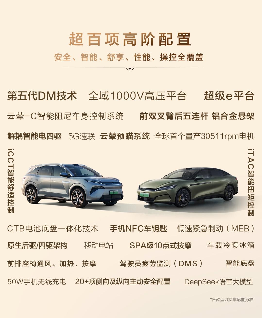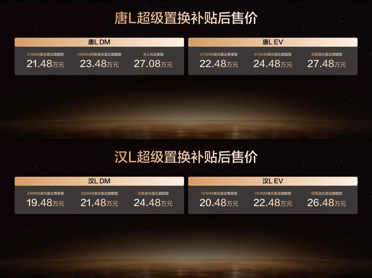 比亚迪汉L唐L携新配色和OTA正式发布,全系标配超百项高阶配置,补贴后售价19.48万元—27.48万元,科技满配颜值翻倍,你想要的它都有! 汉L推出橄榄绿和西子蓝两款新色,加上黑化运动套件和戟灰运动内饰,一整个运动感和高级感拉满。而唐L则是新增橄榄绿配色,还可选配之前汉L推出的琉光银。 汉L EV和唐L EV全系标配超级e平台,峰值充电功率高达1000kW,充电5分钟续航400公里。在本次广州车展上,比亚迪专门放了一台汉L做兆瓦闪充的演示,现场观看的时候很震撼。汉L DM和唐L DM搭载第五代DM技术,汉L DM零百加速最快3.9s,亏电油耗最低仅3.9L/100km;唐L DM零百加速仅需4.3秒,百公里亏电油耗最低仅4.9L,续航和动力我都要。 另外汉L唐L的智能座舱与辅助驾驶系统都带来了全新OTA升级,智能座舱高阶版-DiLink 150实现了从视觉到交互的全面焕新。加上与好孩子、倍轻松、影石等品牌的合作,打造出更全面的“人×车×家”生态,诠释新时代出行的完美答卷。【来自懂车帝车友圈】