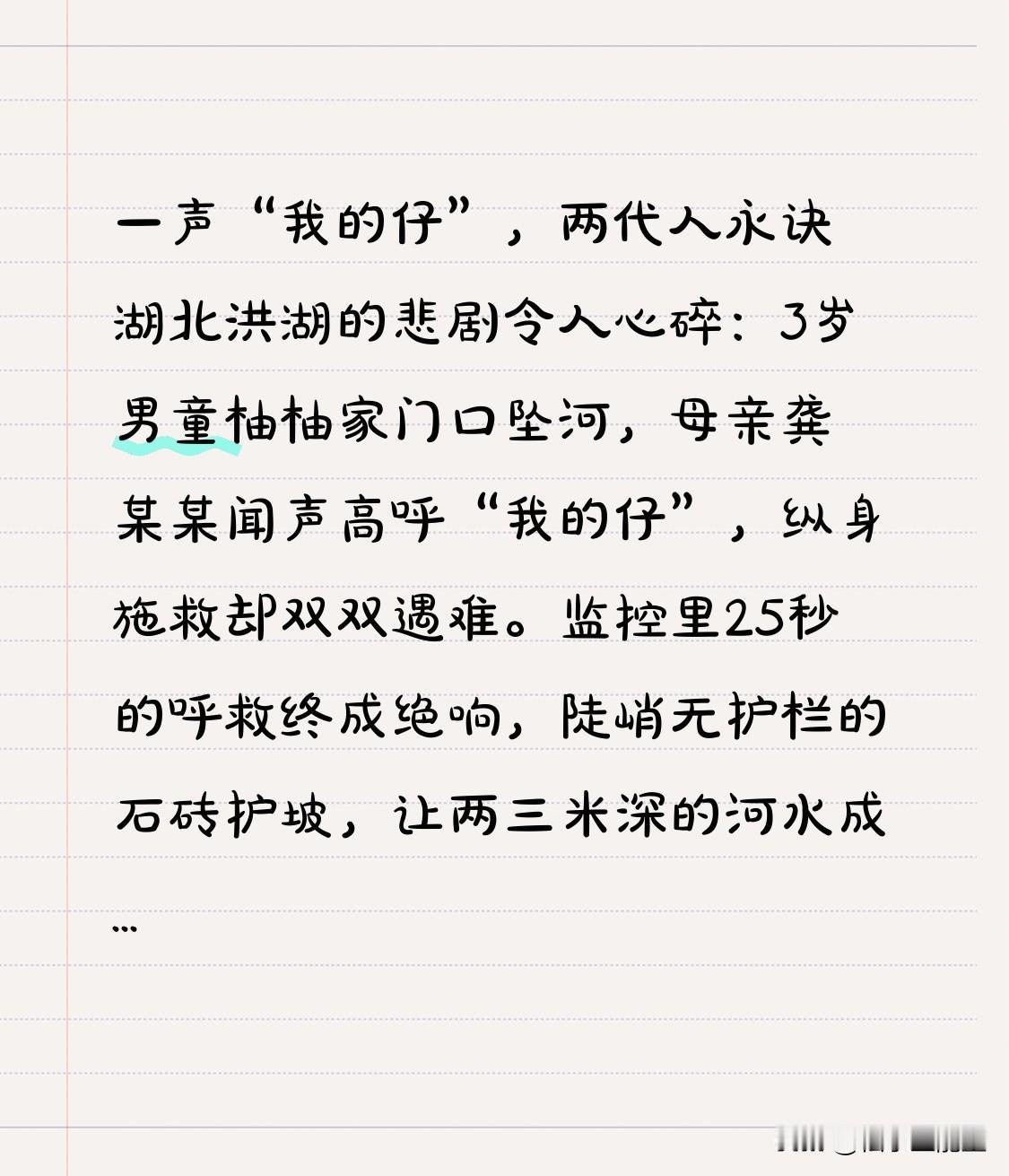 一声“我的仔”,两代人永诀 湖北洪湖的悲剧令人心碎:3岁男童柚柚家门口坠河,母亲龚某某闻声高呼“我的仔”,纵身施救却双双遇难。监控里25秒的呼救终成绝响,陡峭无护栏的石砖护坡,让两三米深的河水成了夺命陷阱。 这并非孤例,该河道曾有溺亡记录,却未补安全短板。母爱本能的奋不顾身,难敌基础设施的缺位。愿逝者安息,更盼悲剧敲响警钟——农村河道安全不能只靠“远离”,补齐防护漏洞,才是对生命的敬畏。