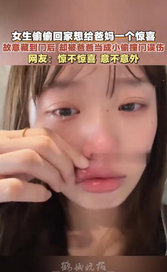[月亮]“这下后悔了吧!”11月21日,广东,一女生放假后,偷偷坐高铁回家,想要给爸妈一个惊喜,妈妈在家听到动静后,怀疑家里进贼了,于是立即给丈夫打去电话,老爸发现门后藏着人,就用门大力的去撞!网友:惊喜变成惊吓了。 据鹤城晚报11月22日报道,女子放假后决定悄悄回家,不告诉父母具体行程,准备来个突然现身的“惊喜”,她觉得,这样的计划能让疲惫一天的父母感到意外的开心。 于是,她背着行李趁父母不在家轻手轻脚地进了屋,又特意躲到了入户门后面,想等他们回来时突然出现,送上这份特别的惊喜。 当她妈妈拎着菜篮推开门时,便听到门后的轻微动静,这样的声音既不像家人走路,也不像家里的东西碰撞,顿时让妈妈心生警觉。 妈妈仔细辨认了一下声音来源,却始终不敢贸然靠近,慌乱中,她立即给正在外干活的丈夫打了一通电话,说家里可能进贼了。 通话中,妈妈的语气拿捏不住颤抖,一连声催促父亲赶快回来。 而正在忙碌的父亲接到电话后,第一反应是担心妻子的安全,他一边冲回家,一边又拨打了小区保安的电话,叫上保安一起过去。 事后父亲表示,当时只想着“情况万一是真的,还是多个人更有底气”,几分钟后,父亲带着保安赶到家中,妈妈紧张地指着门后:“动静就是从那里传来的。” 三个人没有多加犹豫,也没有隔着门喊一声确认,而是一起用力推开门。 这一推,藏在门后的她躺倒在地,被门猛然夹住了头部,只剩下“砰”的一声闷响和随之而来的哭声。 面对这一幕,妈妈愣了好几秒,随后跑过来把女儿扶起,一边揉着她的头,一边不停地念叨“怎么是你啊!”“为什么不提前说一声?” 原本欢欢喜喜的团圆场面,却因一次“突然袭击”成为了混乱的乌龙,女子满脑子都是后悔。 女子倒地哭着捂住嗡嗡作响的脑袋,看着父母从紧张警惕到心疼愧疚,心里懊恼不已。 回归到事件本身,这场乌龙不仅源自女子的初心,也反映了家庭关系中的一项细节共识:沟通永远是最有效的桥梁。 一个简单的提前告知,不仅能增加父母的期待感,更能避免类似的误会或伤害。 本质上,这是亲子间信任与交流的重要体现,对父母而言,分享孩子的行程,能让他们心里有底;对子女来说,与父母沟通其实更能传递关心。 此外,独居长辈如何处理突发情况、及时识别可能风险,也是家庭关注的重点,无论是年轻人还是老年人,如何做好公共环境和私人空间的安全防范,都需要思考。 现代社会中,意外或反差频发,或许我们无法完全避免类似场景的发生,但可以通过事前沟通、应对预案来提升家庭生活中的和谐。 而这种提前安排不仅让每一次团圆更安心,也能让所谓的“惊喜”避免变成“惊吓”。尤其是在家人间,沟通代表着文化的一部分,也意味着一种更成熟的方式。 这次普宁故事所留下的思考,不仅关乎家庭,也关乎安全意识,更关乎人与人之间细节中的关爱。 毕竟,父母永远在乎的,不是突然出现的欢喜,而是你安全、平安的每一次归程,而你呢,是否曾用“惊喜”换来一次尴尬的场景? 信源:据鹤城晚报2025年11月22日报道——女生偷偷回家想给爸妈一个惊喜,故意藏到门后,却被爸爸当成小偷撞门误伤,网友:惊不惊喜,意不意外?