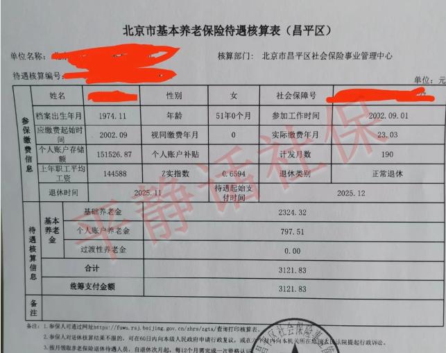 北京不断缴的情况下,缴费23年个账连本带息15万,能拿到多少养老金? 最新实例来了。 女,25年11月退休,缴费23年3个月,个账15.15万,Z实指数0.6594 基础养老金2324.32元 个账养老金797.51元 合计3121.83元 平均工龄单价134元/年 主人公2002年9月参加工作,没有发生过断缴,这就完美避开了北京按照应缴年限计算指数的陷阱。 直接看总金额可能觉得不高,但实际并不低,单价能达到134元。主要是年限比较短,参加工作又晚,没有过渡性养老金。