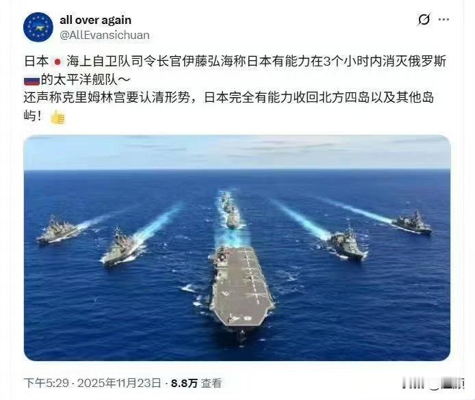 日本海上自卫队第四护卫队群指挥官伊藤弘海发表争议言论,宣称日本有能力在3小时内消灭俄罗斯太平洋舰队,且可收回南千岛群岛(日称北方四岛)等岛屿。伊藤弘海还提及必要时将与乌克兰联手行动。 日本敢于强硬表态,与其军事技术发展和兵力规模相关,其海上自卫队拥有2艘轻型航母、36艘驱逐舰等159艘舰艇,航空自卫队列装147架F-35等先进战机,还在研发超音速弹道导弹、激光武器等装备,且依托《美日安保条约》获得美国军事支持,近年军费占GDP已超2%。而俄罗斯太平洋舰队作为俄海军第二大舰队,总兵力约5.5万人,拥有战略核潜艇、巡洋舰等主力装备,虽部分舰艇存在老旧问题,但具备广阔战略纵深和核威慑等核心优势,并非轻易可被击败。