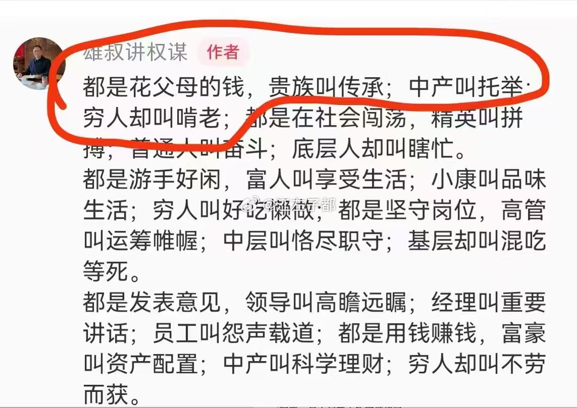 都是花父母的钱,贵族叫传承;中产叫托举穷人却叫啃老;;都是在社会闯荡,精英叫拼搏,普通大叫奋斗;底层人却叫瞎忙。都是游手好闲,富人叫享受生活;小康叫品味生活;穷人叫好吃懒做;都是坚守岗位,高管叫运筹帷幄;中层叫恪尽职守;基层却叫混吃等死。都是发表意见,领导叫高瞻远瞩;经理叫重要讲话;员工叫怨声载道;都是用钱赚钱,富豪叫资产配置;中产叫科学理财;穷人却叫不劳而获。