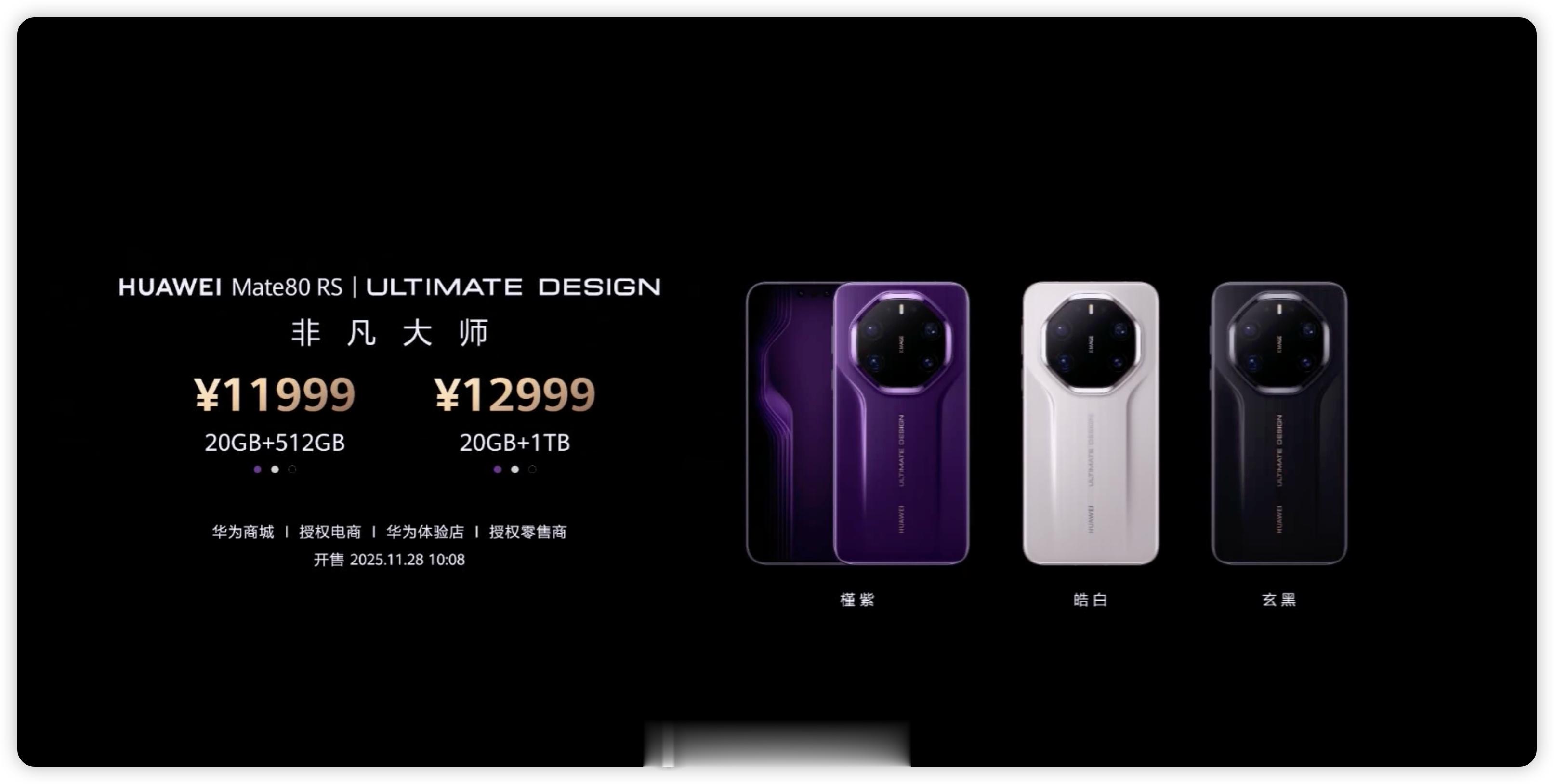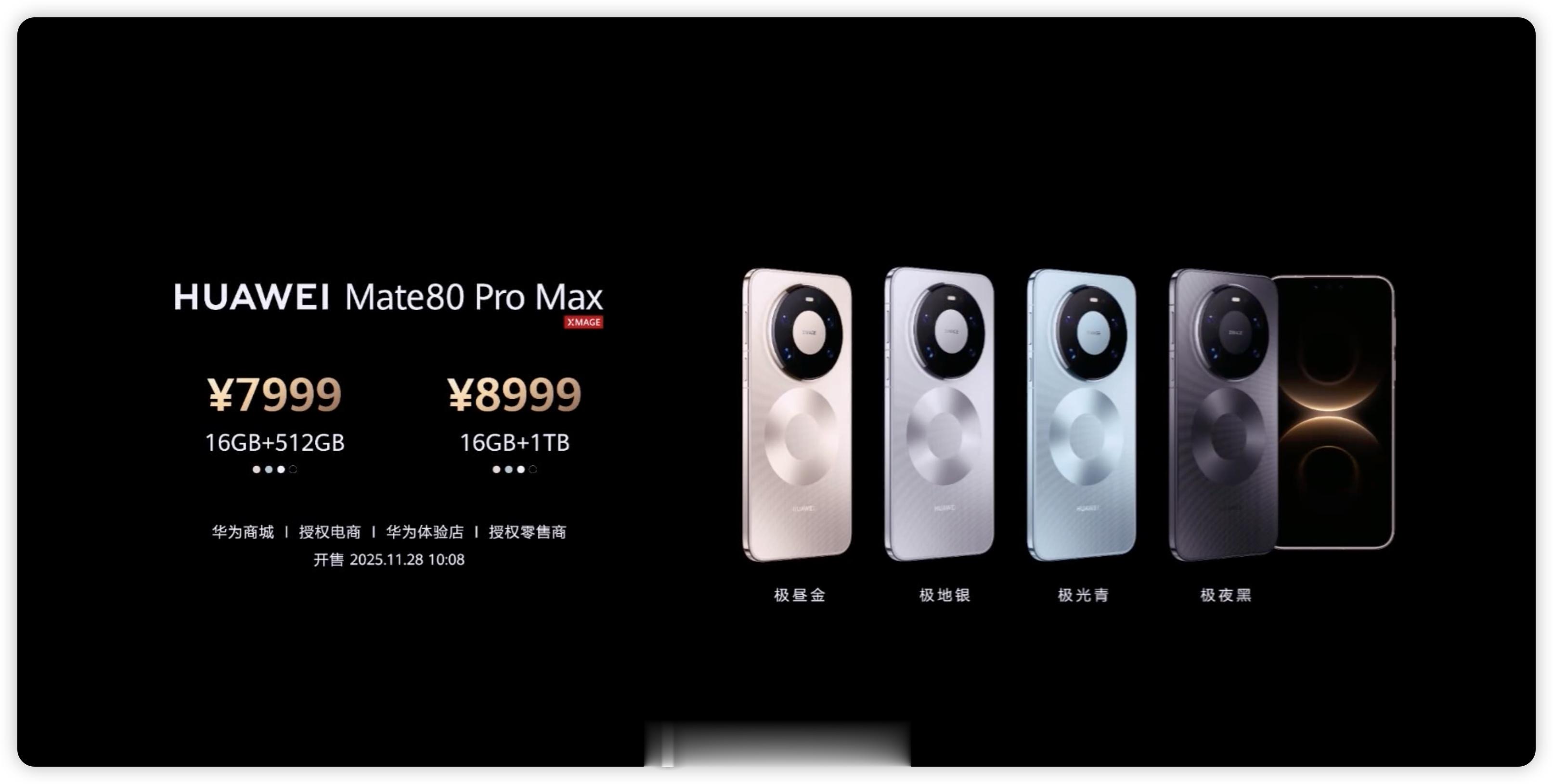 华为 Mate80 系列价格,¥4699 起售Mate8012+256GB,¥469912+512GB,¥519916+512GB,¥5499Mate80 Pro12+256GB,¥599912+512GB,¥649916+512GB,¥699916+1TB,¥7999Mate80 Pro Max16+512GB,¥799916+1TB,¥8999Mate80 RS 非凡大师20+512GB,¥1199920+1TB,¥12999