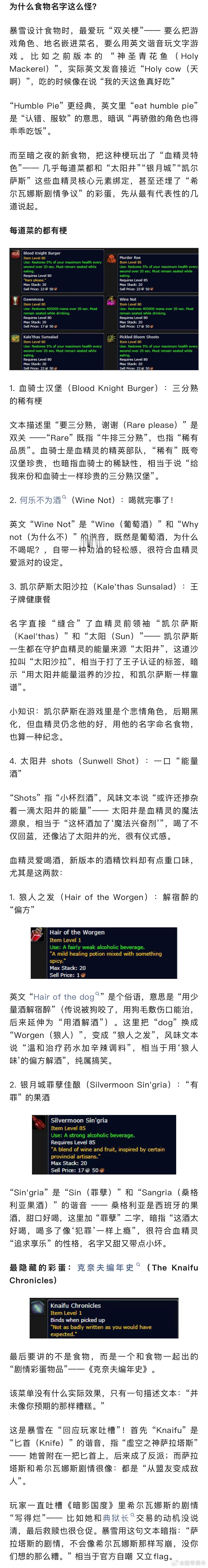 《魔兽世界》12.0至暗之夜版本上线后,血精灵老家奎尔丹纳斯成了美食天堂 —— 商贩们推出的新食物不仅能回血回蓝,名字里还藏满了暴雪式幽默。但不少玩家盯着 “何乐不为酒”“狼人之发” 这些名字一头雾水,其实之所以名字那么怪,是因为暴雪很喜欢在食物上玩梗。