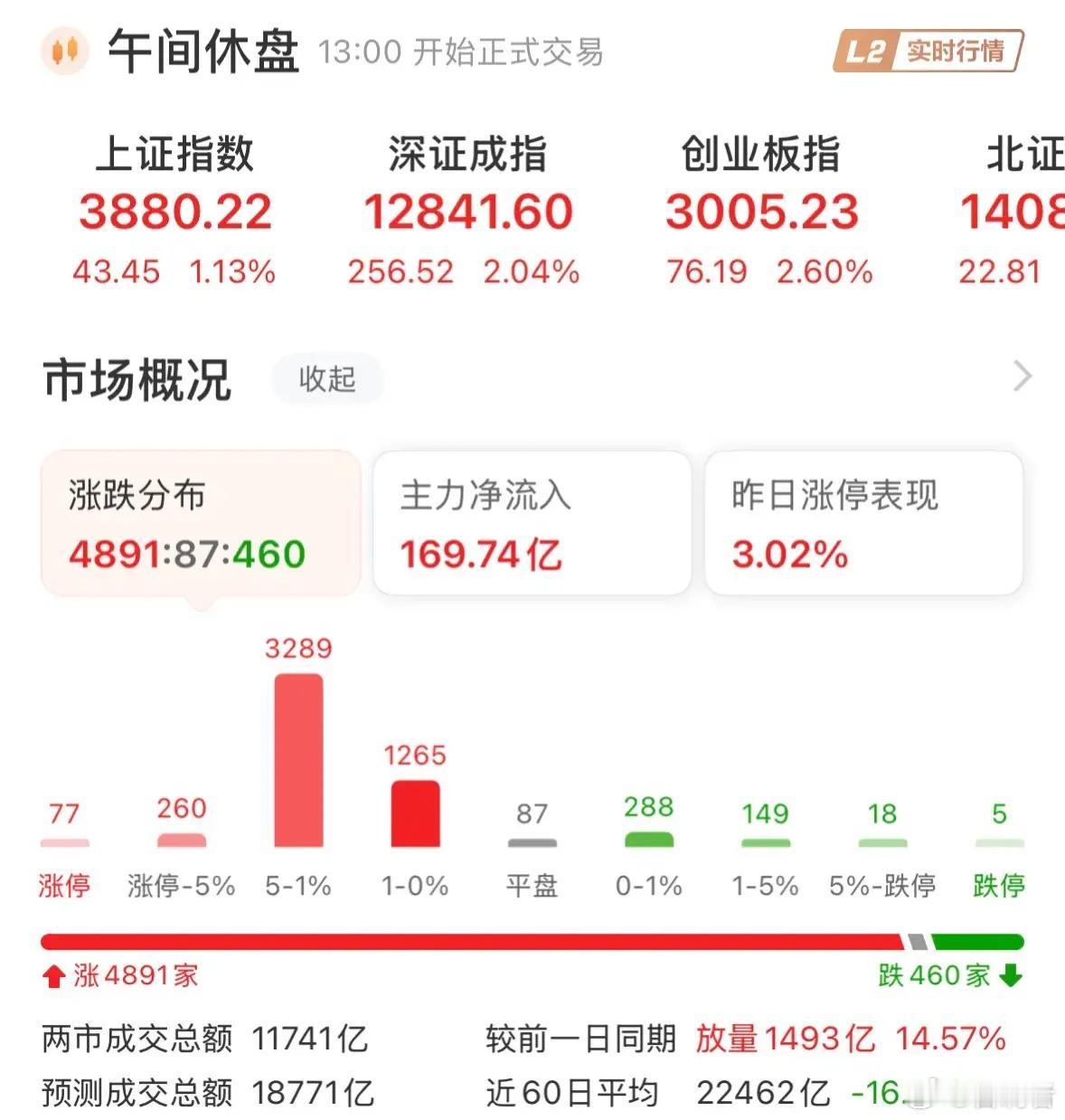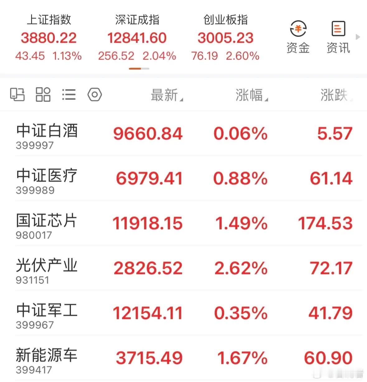 【11月25日基金分析】全面反弹,近5000家上涨!今天市场终于是高开高走了,来了个有力的反弹行情,市场连跌这么久,昨天还高开低走,才微微收红,今天正式反弹,涨幅不错,个股上涨超4800家,整体不错!截止到午间收盘,上证指数上涨1.13%,创业板指数上涨2.60%,放量上涨,主力净流入,盘中虽然有些冲高回落,但是力度不大,整体依旧没问题,昨天纳指也是涨幅可观,今天跟着情绪走,但是持续反弹会有难度,注意谨慎追高!我们下面来看板块操作思路!白酒板块:白酒上涨0.06%,没什么大反应,就这样,手中仓位不动,放着吧!医疗板块:医疗上涨0.88%,涨幅也比较小,板块弱势,没什么人气,先回7000!半导体板块:半导体上涨1.49%,昨天提示要止跌了,也在下午收红了,今天继续上涨,两天加起来的表现还行!光伏板块:光伏上涨2.62%,昨天也是说过了短期到位了,今天成功大幅反弹,不错的!军工板块:军工上涨0.35%,开盘还出现直线下跌,昨天尾盘拉太猛了,收涨4个点,轻仓可持有,目前也是回到12000的支撑区间!新能源车板块:新能源上涨1.67%,涨幅不算多,也是这几天大跌跌怕了,情绪还没有一下子恢复,这也还可以了,继续持有!最后我们总结一下:昨天没有大涨,只是开了头,今天正式反攻,整体表现不错,但是短期连续反弹还是挺有难度的,因为连跌这么久,人气还是比较衰减的多,恢复需要时间,不急于一时,恢复趋势的话还是需要市场合力的!