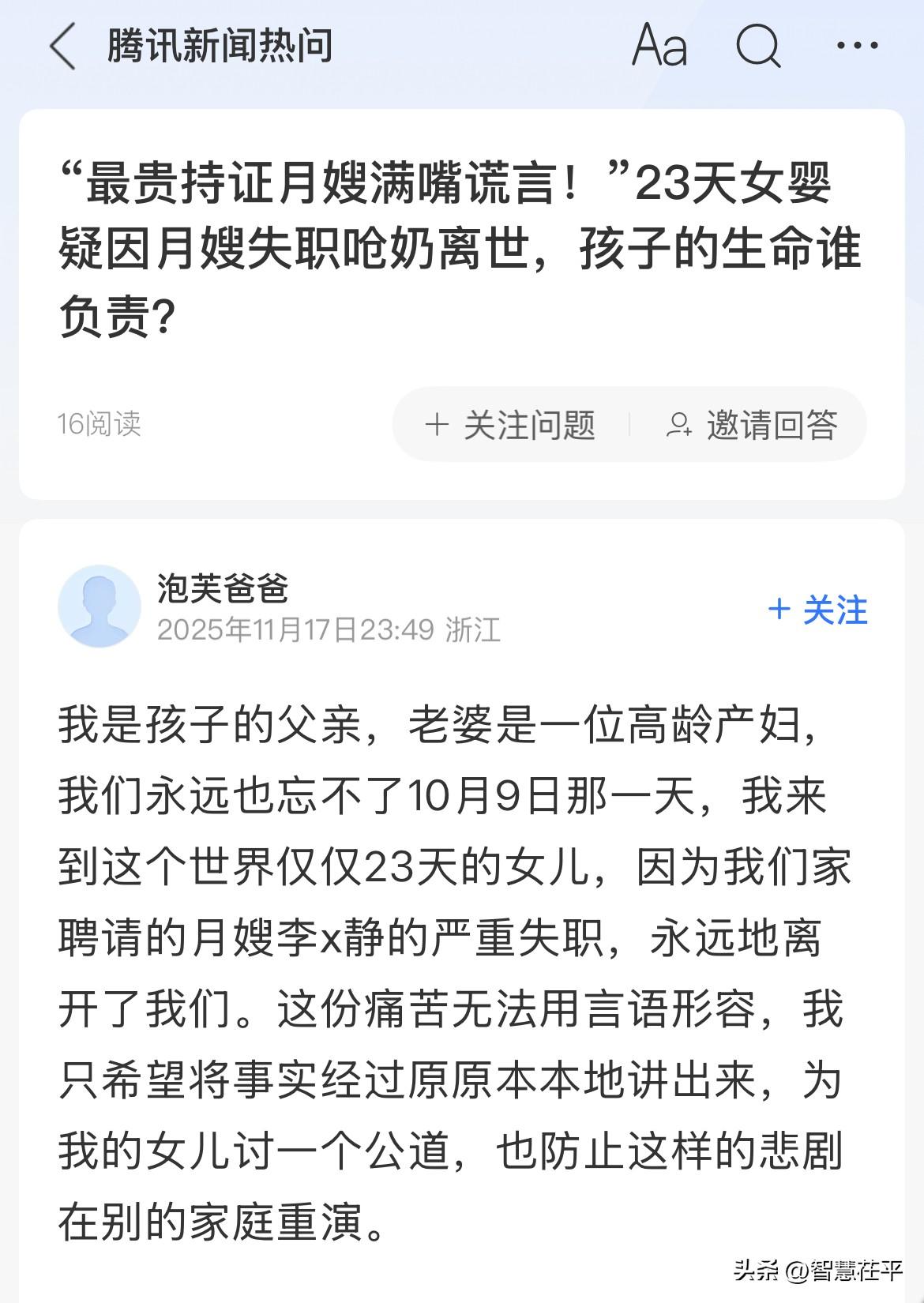 【杭州23天大女婴疑被月嫂喂奶呛死,“月薪1万8,事后没事一样找新雇主”——多方回应引发热议】 近日,杭州一名23天大的女婴疑似在月嫂的照料下不幸去世,引发社会广泛关注。令人震惊的是,事发后月嫂似乎没有任何愧疚或悔意,甚至继续寻找新的雇主。这背后隐藏的行业乱象和监管缺失,值得我们深思。 事件回顾: 据家属透露,女婴在月嫂的照料下突然出现窒息状况,紧急送医后不幸去世。事后,月嫂表现得若无其事,似乎事不关己。更令人担忧的是,月嫂的高薪(月薪1万8)是否意味着行业存在“高风险、高回报”的潜规则? 多方回应: 家属悲痛:希望相关部门严查责任,给孩子一个交代。 行业人士:部分月嫂缺乏专业培训,行业监管亟待加强。 官方回应:将依法依规调查,确保事件得到公正处理。 事件背后的深层次问题: 行业监管不足:月嫂培训、资质审核不严,存在“黑中介”。 职业道德缺失:部分从业者缺乏责任感,安全意识薄弱。 家庭安全意识淡薄:部分家庭对雇佣月嫂缺乏基本了解和监督。 我们应当做些什么? 加强行业规范:推动建立完善的月嫂培训、认证体系。 提升家庭安全意识:家庭在雇佣时应多方考察,密切关注照料过程。 监管部门加大执法力度:严惩违法违规行为,保护婴幼儿生命安全。 生命无价,安全第一。 每一个孩子都值得被呵护,每一份职业都应被尊重和规范。希望此事件成为行业变革的起点,让家庭和孩子的安全得到真正保障。