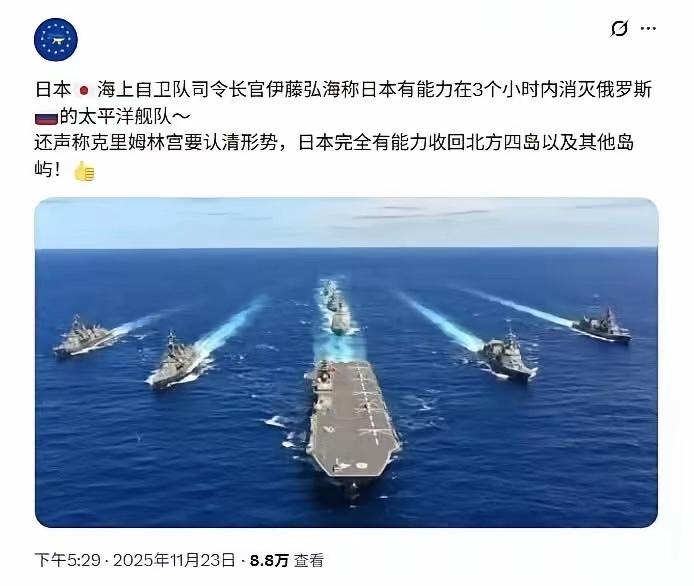 这个世界上要论猖狂,非小日子不可,这不现在他来! 日本海上自卫队司令长官伊藤弘海称,日本有能力在3个小时内歼灭俄罗斯太平洋舰队!其声称克林姆宫要认清形势,日本完全有能力收回北方四岛及其他岛屿! 这位日本海上自卫队司令长官的话算是猖狂到没边了!三个小时,日本海上自卫队全灭俄罗斯太平洋舰队!如果真要如此,估计日本的灭亡也要按照小时计算了!
