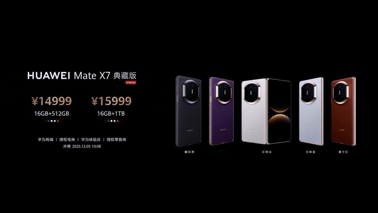 华为 Mate X7 发布,价格和去年 Mate X6 一致,12+256GB 售价 12999 元、12+512GB 售价 13999 元、16+512GB 典藏版售价 14999 元、16GB+1TB 典藏版售价 15999 元、典藏版手写笔套装 20GB+1TB 售价 17599 元。 - 芯片:华为 Mate X6 +1 代 Pro 芯片,性能比上代提升 42%,3550mm² VC 散热; - 外屏:6.49 英寸 2444×1080 OLED 外屏,局部峰值亮度 3000nits,支持 1-120Hz LTPO,1440Hz 高频 PWM 调光,支持 10.7 亿色,第二代玄武钢化昆仑玻璃(典藏版); - 内屏:8 英寸 2416×2210 OLED 内屏,局部峰值亮度 2500nits,支持 1-120Hz LTPO,1440Hz 高频 PWM 调光,支持 10.7 亿色,三重复合叠层结构设计,搭载非牛顿流体保护层、UTG 玻璃抗压层和碳纤维支撑层; - 铰链:玄武水滴铰链(超强火箭钢,2350MPa),支持多角度悬停; - 相机:外屏前置 8MP(F2.2 光圈),内屏前置 8MP(F2.2 光圈),典藏版后置 50MP 主摄(1/1.28",17.5EV,F1.49~F4.0 光圈,OIS,RYYB,Mate 80 Pro Max 同款),标准版后置 50MP 主摄(1/1.56",F1.4~F4.0 光圈,OIS,RYYB);40MP 超广角(F2.2 光圈,RYYB)+ 50MP 潜望长焦(F2.2 光圈,3.5X 光学,OIS)+ 第二代红枫原色摄像头(色彩还原度提升 43%,进光量提升 96%); - 续航:5600mAh 硅碳负极电池,支持 66W 快充、50W 无线快充; - 其他:折叠厚 9.5mm,展开厚 4.5mm,重 235g,云锦白、云锦蓝、幻影紫、曜石黑、寰宇红 5 款配色,支持 IP58 & IP59,蓝牙 6.0、星闪 E2.0、NFC、USB 3.1 GEN1,侧边指纹识别,支持双向北斗卫星消息、天通卫星通讯(标准版仅北斗),2.4GHz 畅连无网通信,700MHz 无网应急通信,预装 HarmonyOS 6.0 系统,首发户外探索模式。