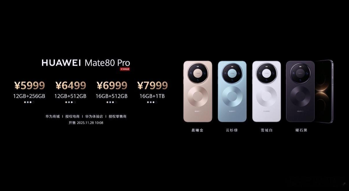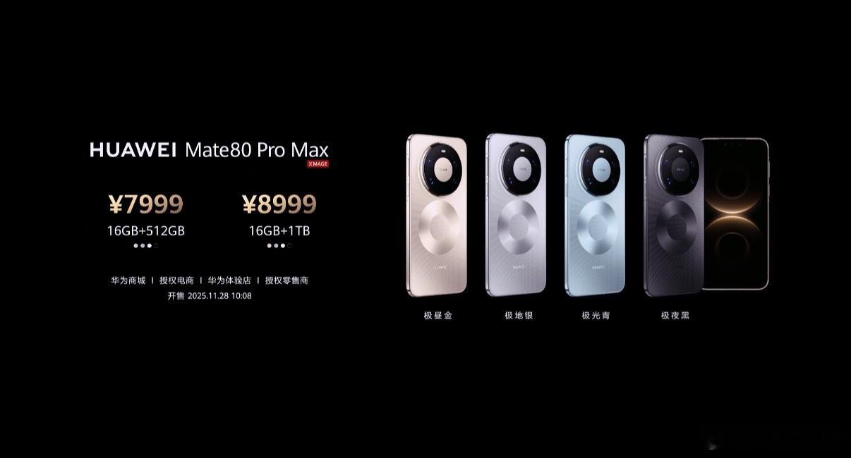 价格公布:华为Mate80,4699起华为Mate80 Pro,5999起华为Mate80 Pro Max,7999起华为Mate80 RS非凡大师,11999起。