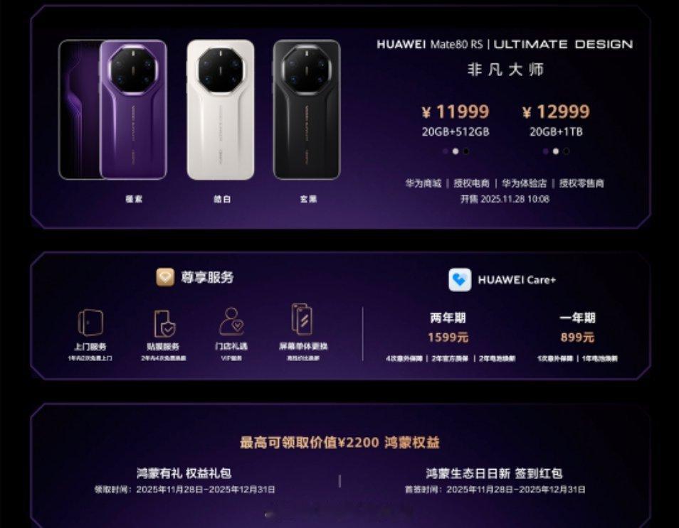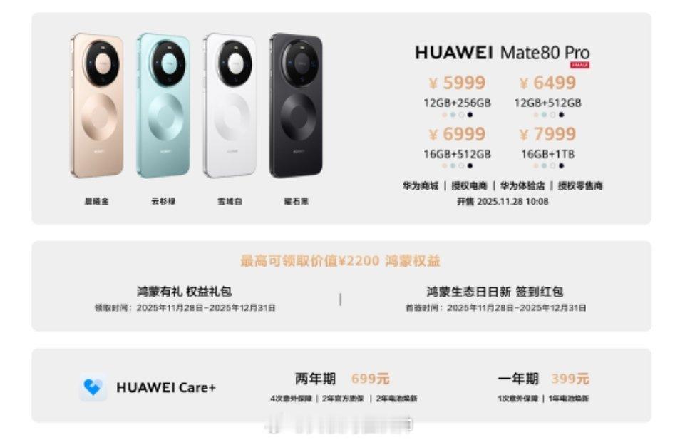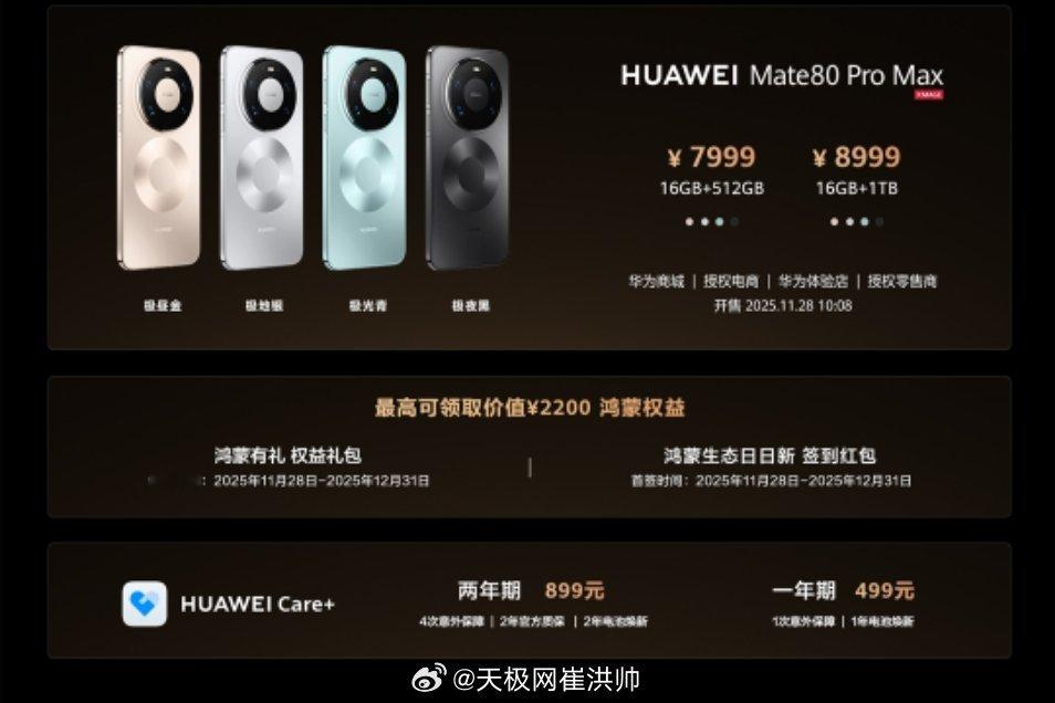 华为Mate 80售价4699元起;华为Mate 80 Pro售价5999元起;华为Mate 80 Pro Max售价7999元起;华为Mate 80 RS 非凡大师售价11999起;11月28日10: 08正式开售。