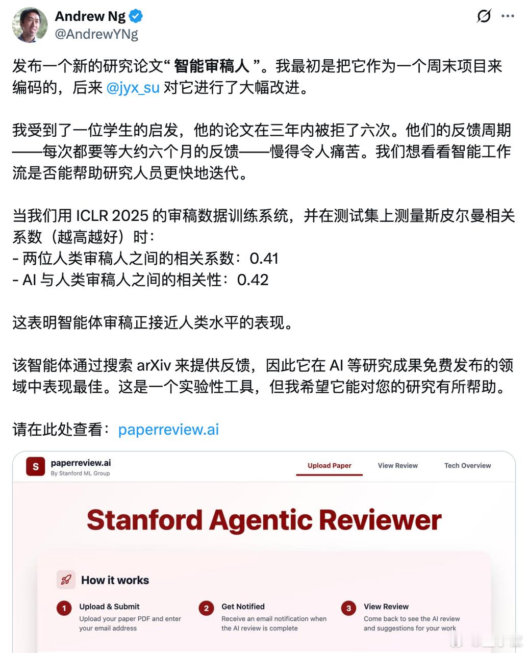 吴恩达团队发布了开源项目Agentic Reviewer,专门用来自动评审论文。起因是,吴恩达手下一个学生,3年内投稿6次全被拒,每次光等审稿反馈就要半年。于是团队索性做了这个工具,希望研究者能快速拿到高质量反馈,加速迭代。评论区有人表示:不用等6个月被人类拒稿了,现在AI在几分钟内就能拒绝你,早拒早改早提交。这个工具解决了科研中的痛点:传统评审不仅周期长,而且收到的评论大都聚焦在"不值得发表",很少给出具体修改建议。项目的工作流程是这样:提交论文后选择投稿的期刊或会议,系统会根据那个会议的评审风格来判断。它会把PDF转成Markdown,提炼关键词,然后用搜索工具去arXiv上找最新相关研究,挑出最相关的论文进行总结,最后结合原文和这些总结,按模板给出完整的评审意见和具体可操作的修改建议。团队还训练它模仿ICLR 2025的评审给论文打1到10分。具体是先从原创性、研究问题重要性、结论是否有依据等7个维度打分,再算出最终分数。测试数据显示:用ICLR 2025的真实评审数据做Spearman相关性测试,AI审稿人vs人类审稿人的相关性是0.42,而人类审稿人vs人类审稿人才0.41。也就是说,AI的评审逻辑和人类审稿人的一致性非常高,甚至在数值上略微胜出。需要注意的是,AI审稿主要参考arXiv上的内容,所以目前最适合AI、计算机科学等相关领域,这些领域的最新研究和相关工作都在arXiv上公开可查。感兴趣的科研人可以体验一波:paperreview.ai/