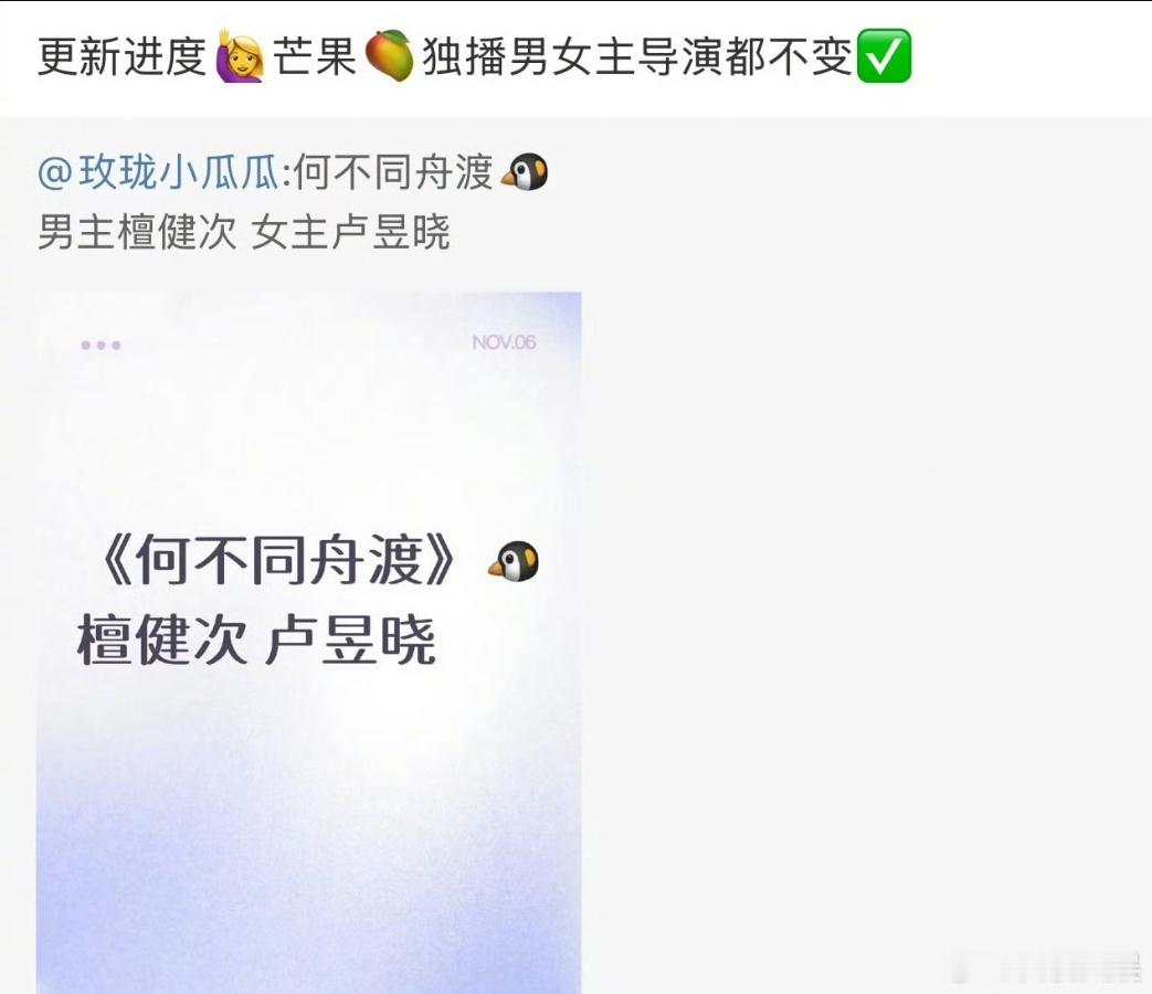 檀健次卢昱晓主演的《何不同舟渡》开通官方微博,专属账号的亮相为作品搭建起与大众沟通的桥梁,传递核心信息。