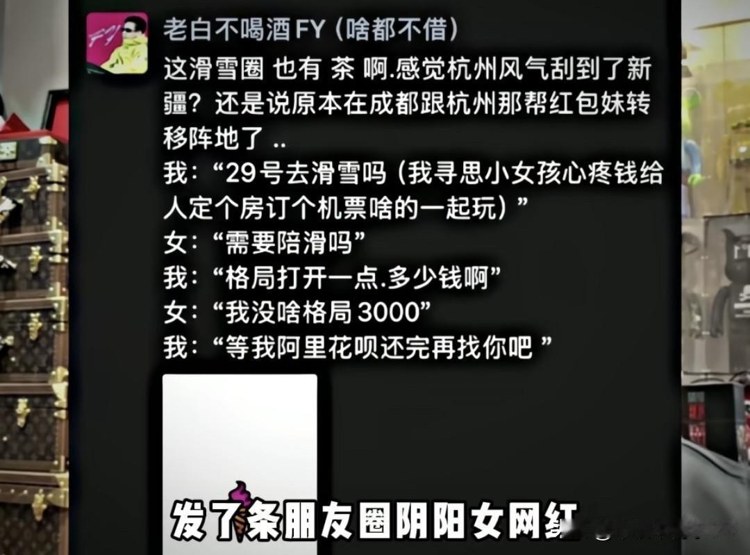 百万博主老白自费请女网红去新疆滑雪,住宿路费全包,结果对方要收3000块陪滑费,不给就挂平台说他想白嫖。 老白刷到个爱滑雪的女网红,刚好自己要去新疆滑雪,就想着邀请对方一起,还全包住宿路费。结果出发前,女网红突然开口要3000块陪滑费,4小时就要这么多,老白觉得自己都包了所有费用,而且是本着交朋友的心态,就以自己花呗没还完拒绝了。 没想到下一秒对方就说可以套现8000来付, 老白发了条朋友圈吐槽,女网红看到后直接破防,各种脏话骂他。还把部分聊天记录挂到视频里,甚至曝光了老白的个人信息和联系方式,拉着自己的小姐妹建群,在小红薯上引导网友围剿老白,说他想白嫖。 好在网友眼睛雪亮,看到完整聊天记录后,都觉得老白冤,纷纷力挺他。老白也不是吃素的,直接保留证据报官处理了。现在女网红曝光老白信息的视频也不见了。 这事儿你们怎么看?