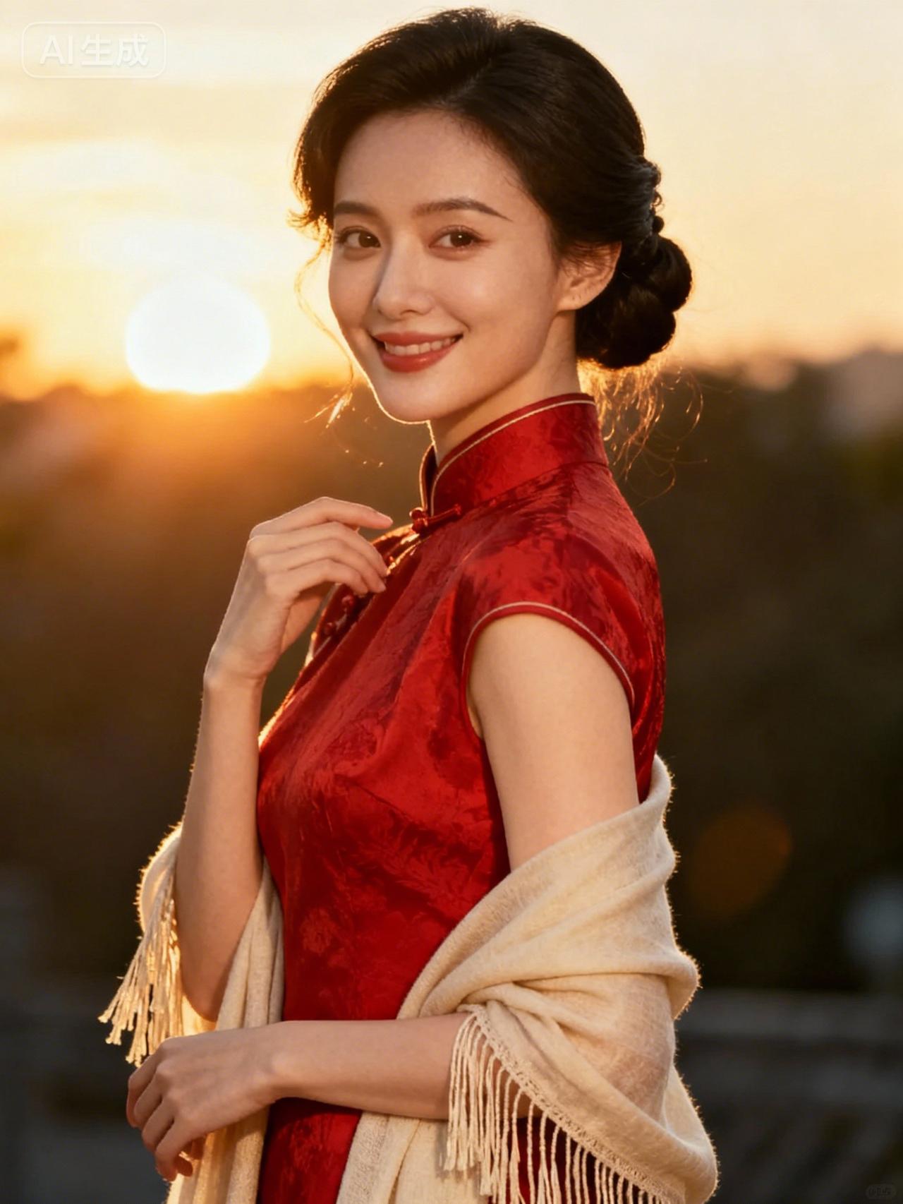 夕阳下的古典美人,红衣飘逸,笑靥如花。