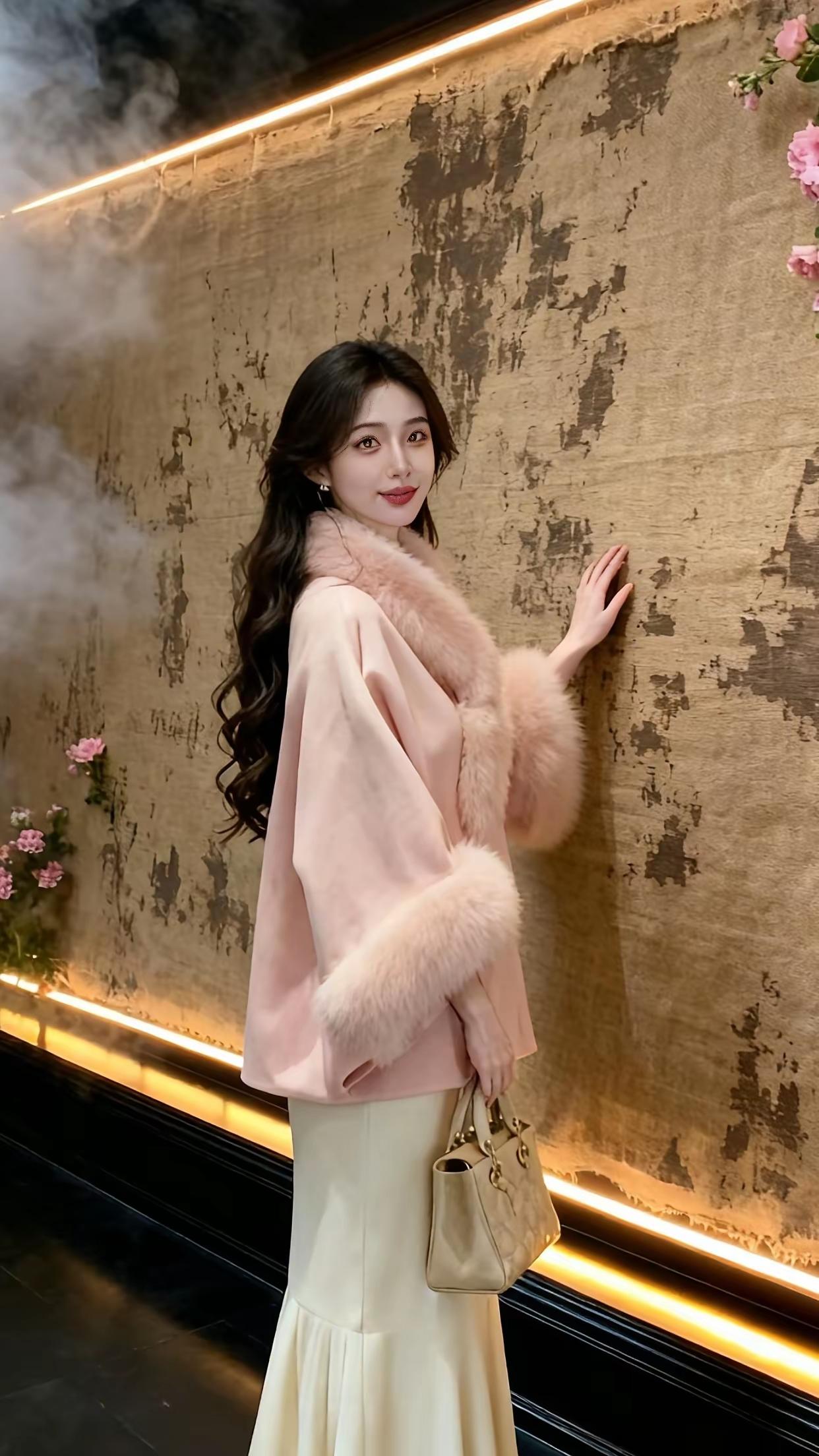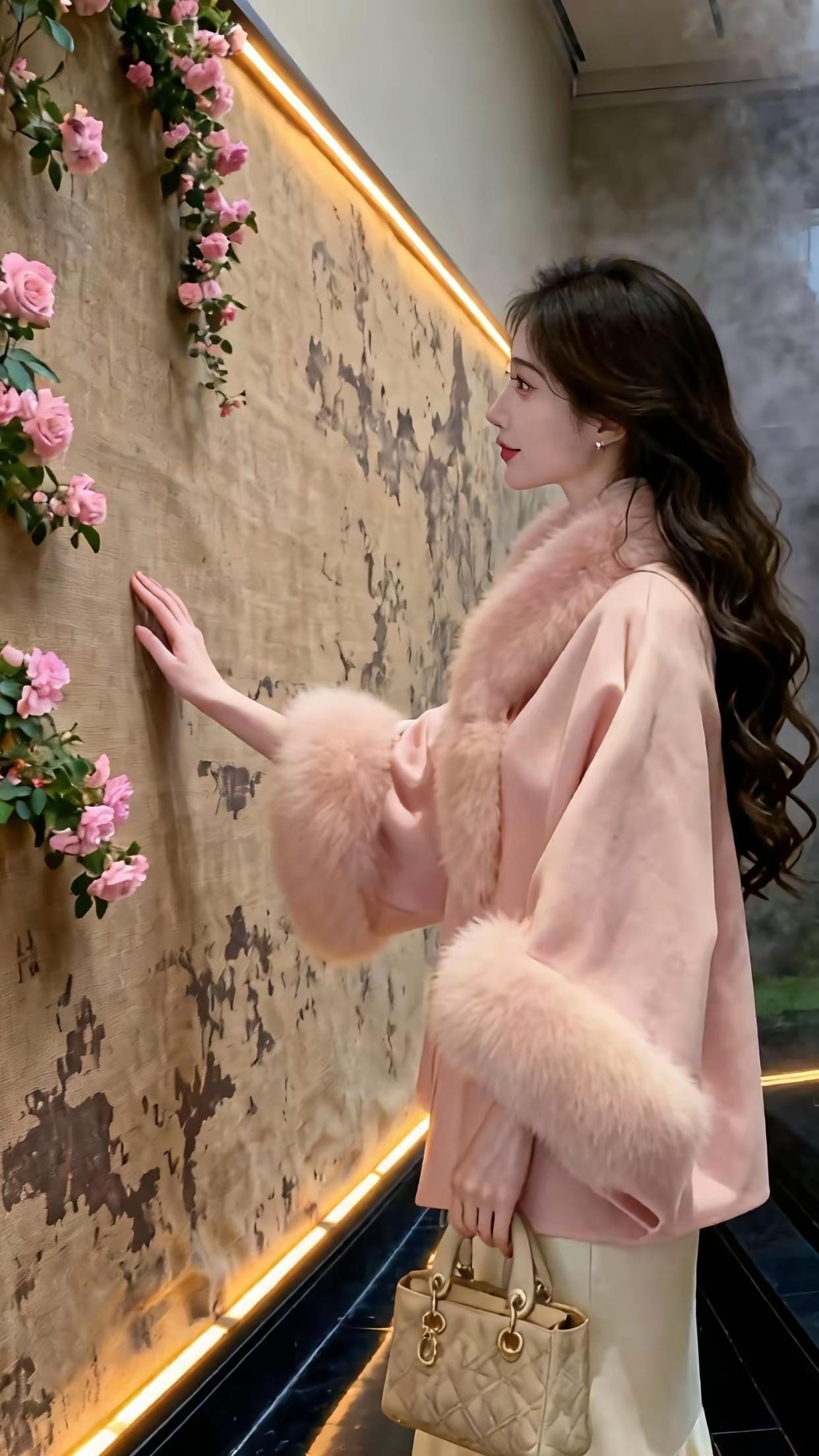 优雅漫步在古风庭院,粉色毛绒外套与长裙相得益彰,尽显温婉气质。