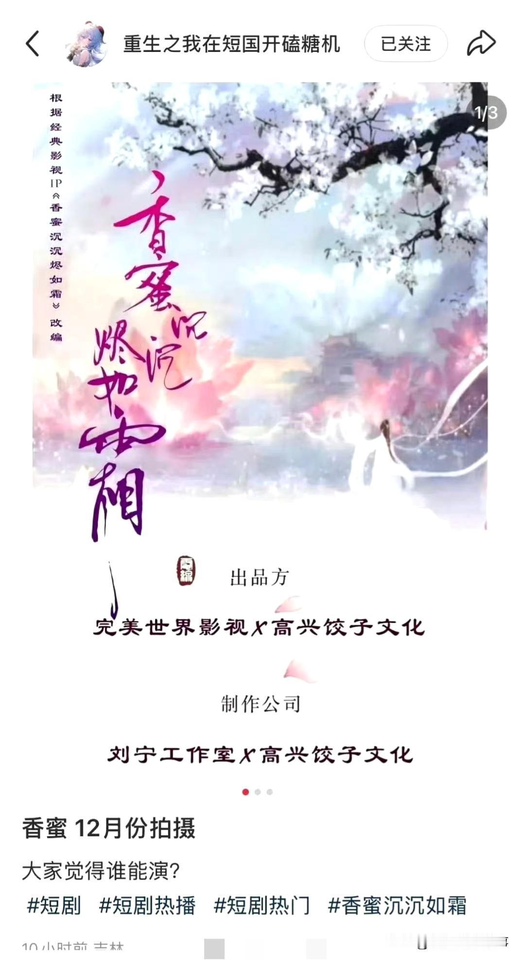 《香蜜》短片让润玉当男主?是“填坑”还是“拆CP”? 《香蜜》要拍短片,项目表里润玉压番旭凤——这波操作,显然是盯上了润玉的“美强惨”人气。剧版里他是孤坐九重天的天帝,短片若让他成男主,或许能补全他的深情线。 但老粉怕是要皱眉:锦觅与旭凤的三世纠缠才是《香蜜》内核,换男主等于重写故事。可若能圆了润玉的遗憾,倒也算另一种圆满。你是想嗑新糖,还是守旧嗑?