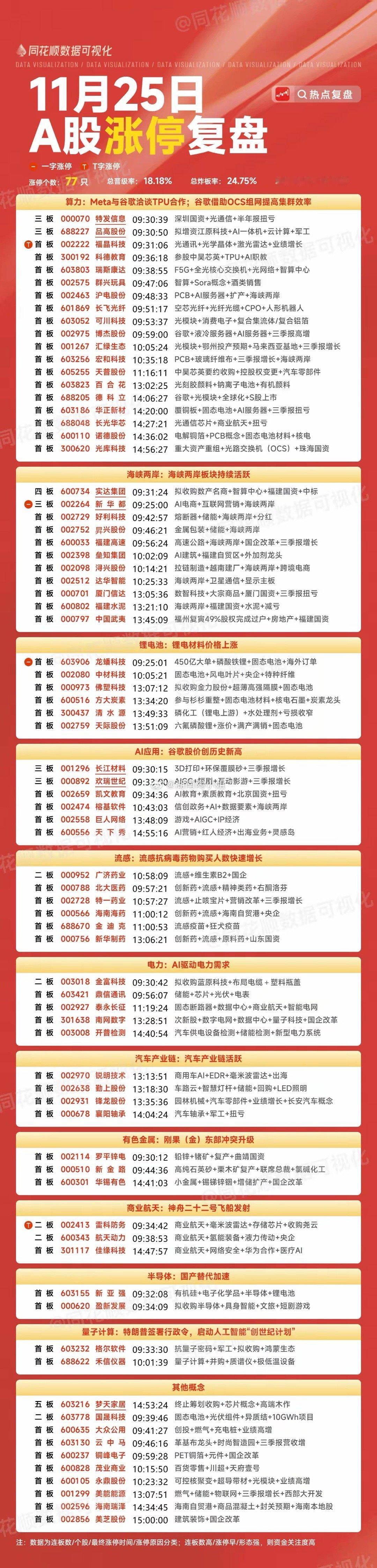 11月25日,今日涨停复盘(涨停77个),包括算力、海峡两岸、锂电池、AI应用、