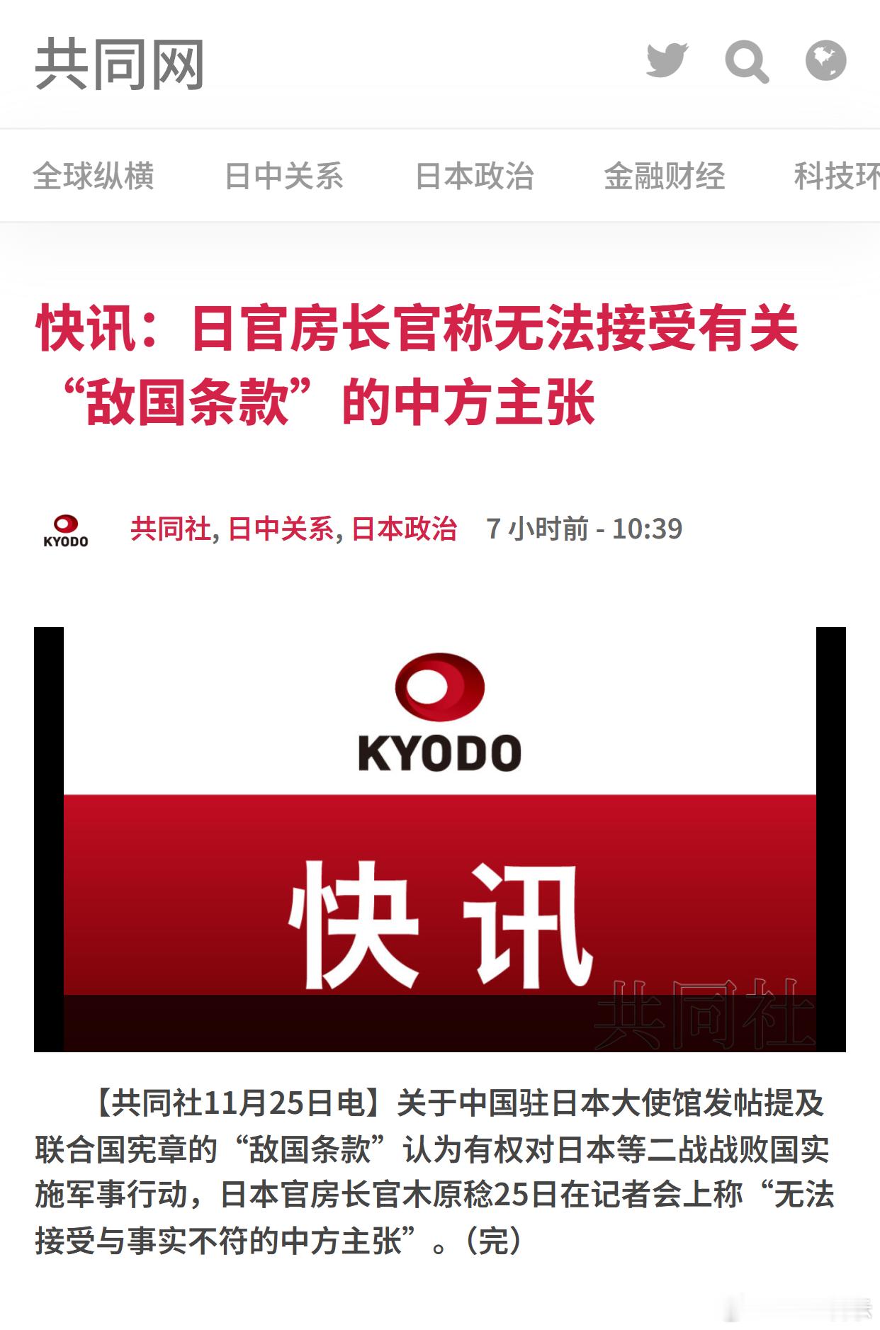 日媒:日官房长官称无法接受有关“敌国条款”的中方主张