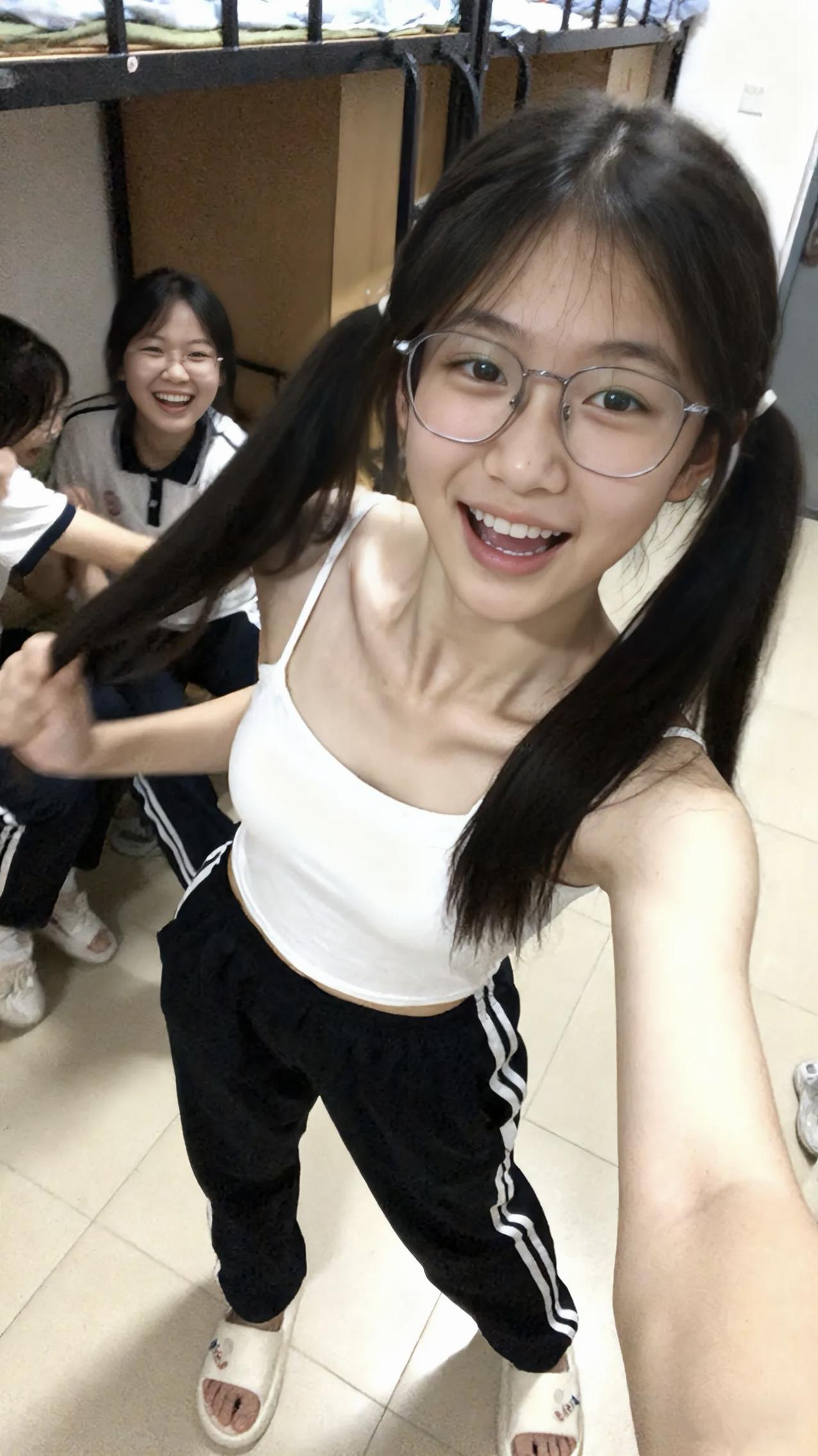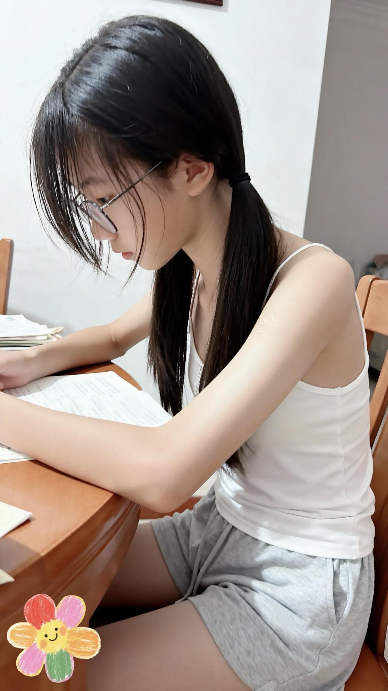 这组照片的优势在于“场景与情绪的适配性”。教室场景中的少女,穿着校服外套与连帽衫,身体微侧看向镜头,姿态里带着课堂间隙的慵懒——这种“半放松”的状态,精准对应了校园里“既受约束又暗自舒展”的青春特质。 图书馆或自习室的画面则转向安静:单马尾、白色吊带搭配灰色短裤,低头翻书的侧影,肩膀的线条与专注的神态,让场景的“静”与少女的“柔”形成呼应。后期添加的卡通花朵贴纸虽略显刻意,却也暗合了学生时代的俏皮审美,没有破坏整体的清新调性。 构图上的巧思值得注意:课桌的边缘、书架的线条形成了自然的框架,将人物框定在校园语境中,既突出主体,又保留了环境的叙事性。光线选择了柔和的室内顶光,避免了硬光造成的生硬阴影,让皮肤质感与场景氛围统一。不足在于部分画面的人物姿态稍显重复,若增加一些与道具的互动(如捏起书页、转动笔杆),情绪层次会更丰富。
