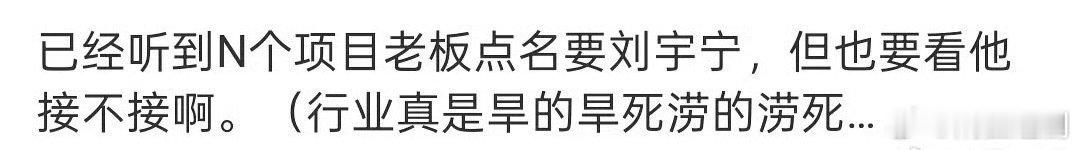 网传N个项目高层点名要刘宇宁,看来刘宇宁对市场的敏锐度的确先人一步,半年过去了,
