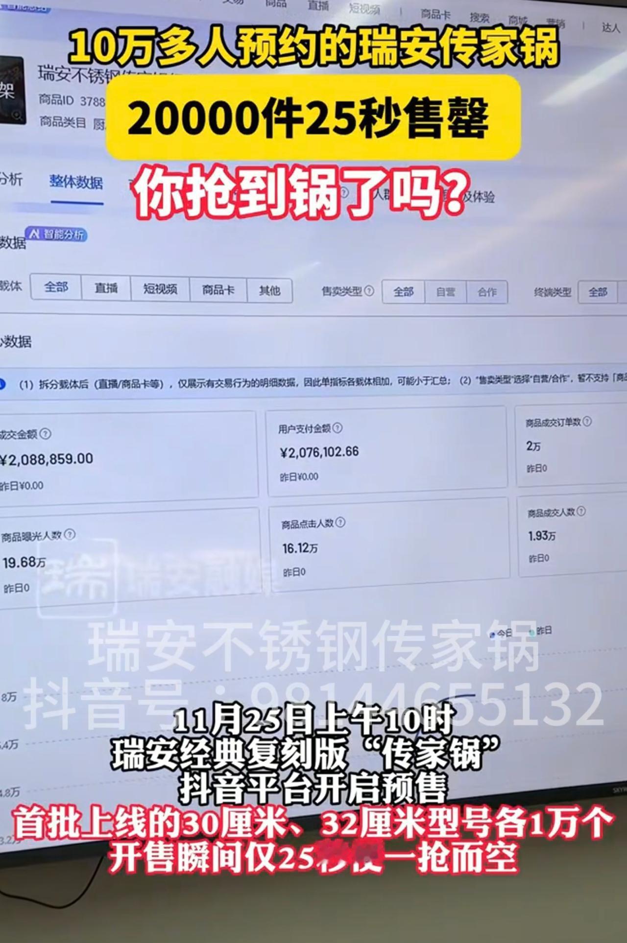 大家抢到浙江瑞安“传家锅”了吗。 据说2万个锅25秒抢没了,而在预售前也是炒的特别火热,一方面网友亲自证实了实用性,喊话快点生产,另一方面听老板介绍,每个都是开锅40分钟。 反正不管怎么样都抱着试一试的想法,毕竟全身304不锈钢材质,成本在93-97元之间,而售价99元,怎么算都很合适。 希望真如介绍的真材实料,目前只是首批生产,只有口碑做起来才能越走越远。话说大家对这个“锅”感兴趣吗。瑞安不锈钢锅 瑞安传家锅 传家锅